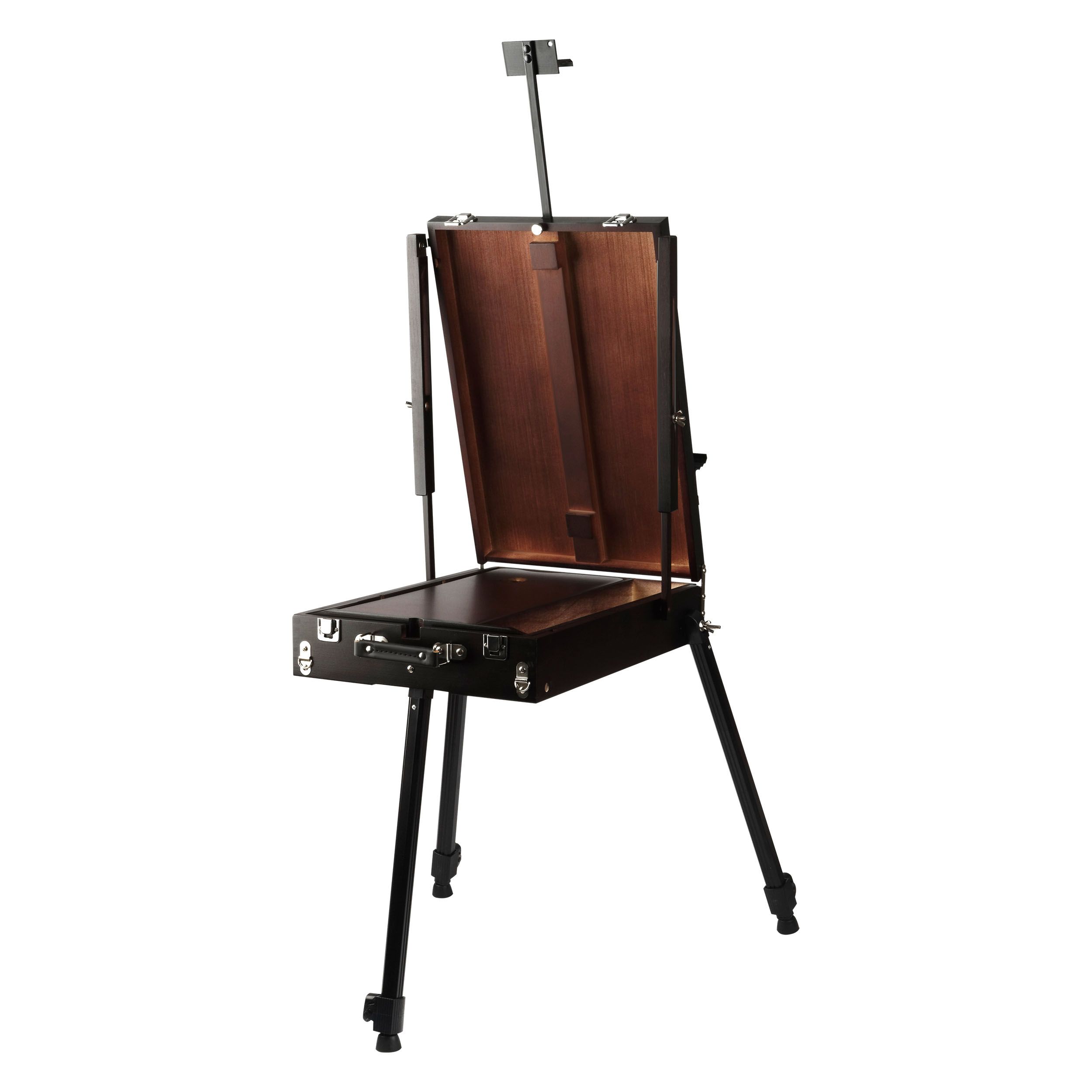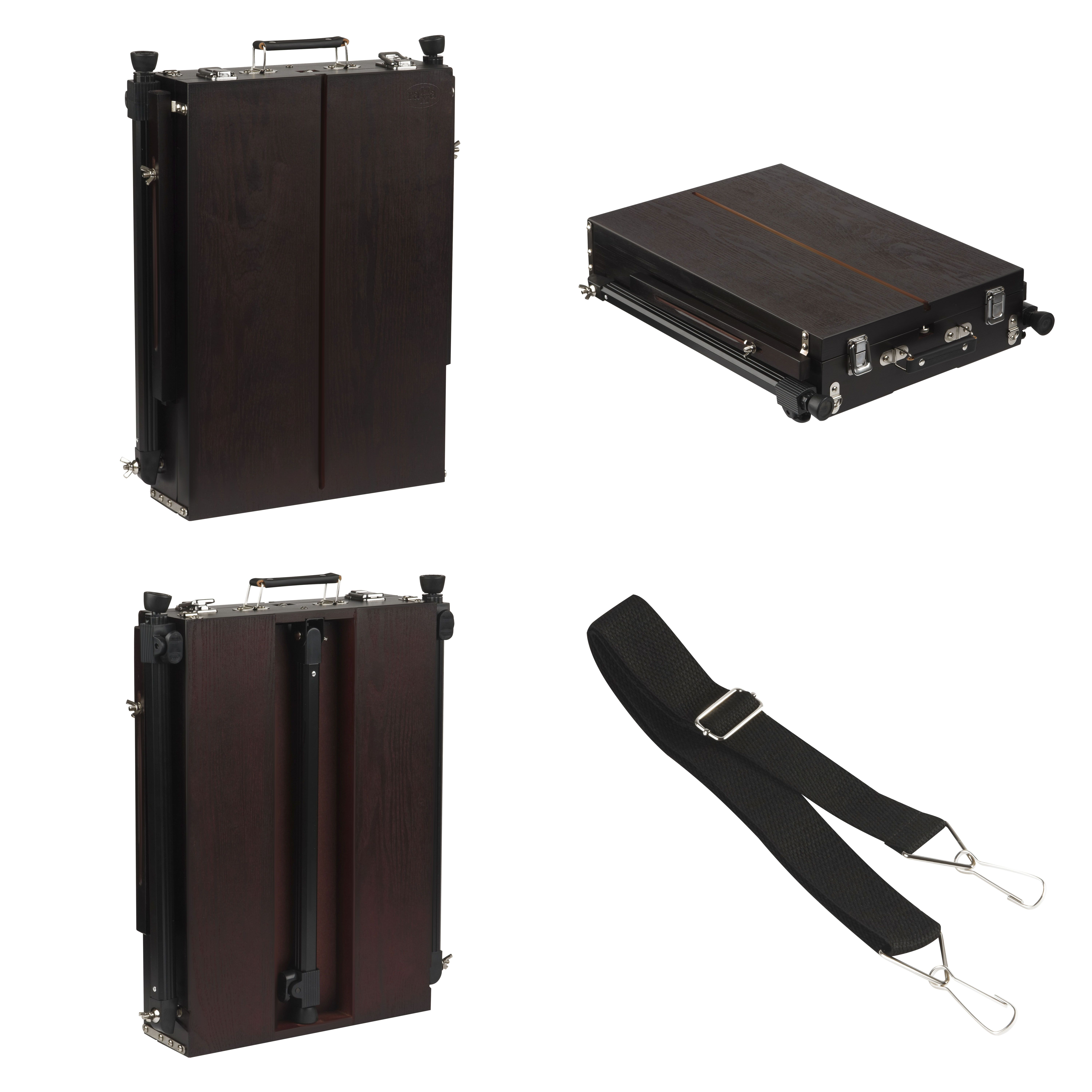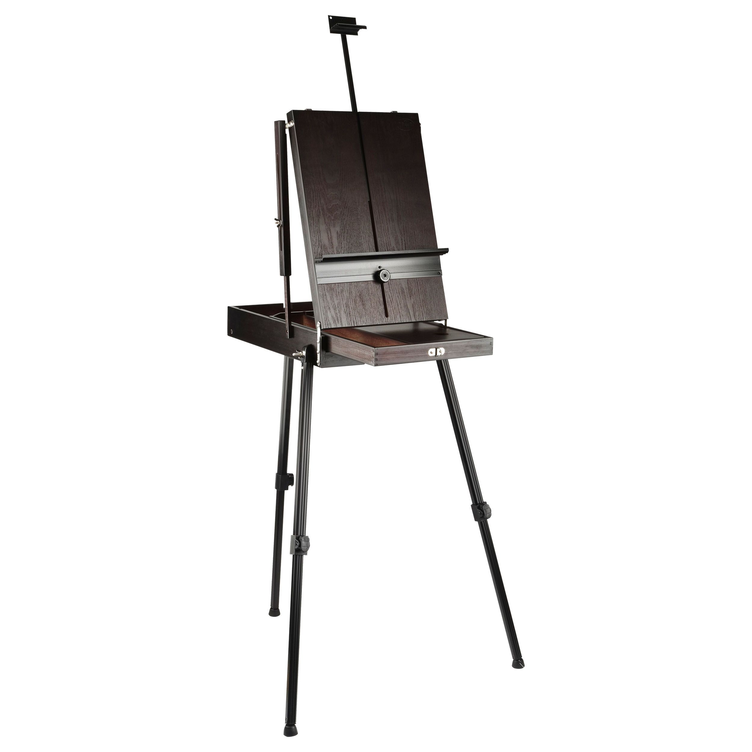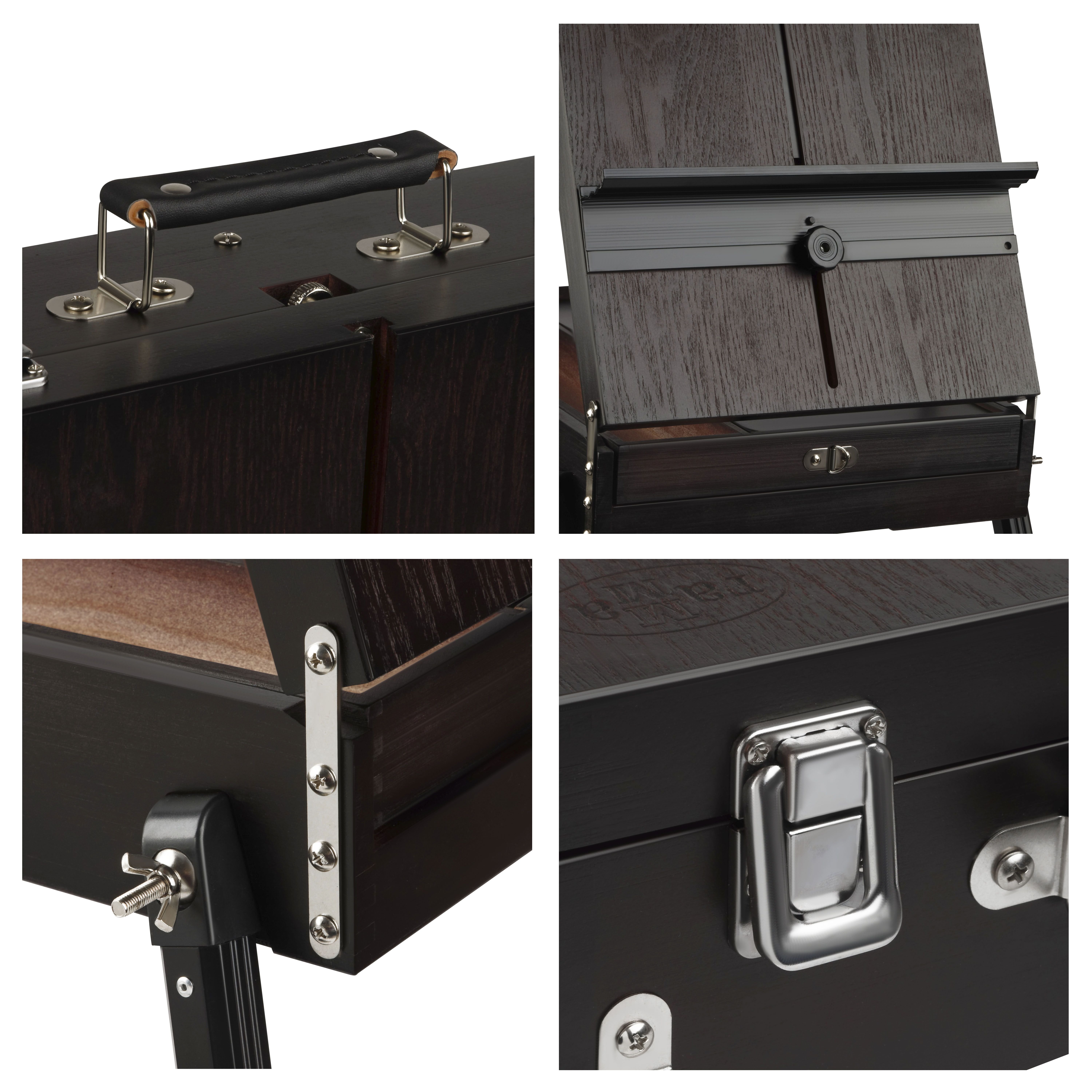 Этюдник оснащён выдвижным ящиком с металлической обивкой и модульной системой перегородок для хранения художественных материалов. Также в комплект входит палитра. Деревянные ножки регулируются по высоте, простая система крепления позволяет надёжно зафиксировать холст. Изготовлен из сосны. Цвет - коричневый