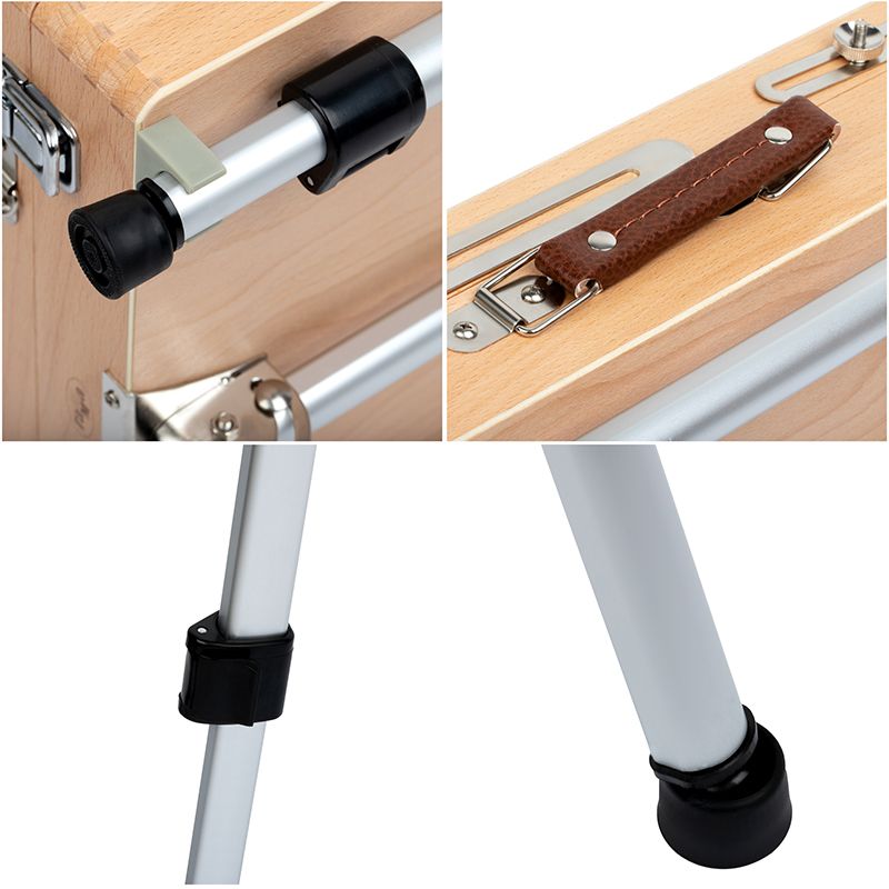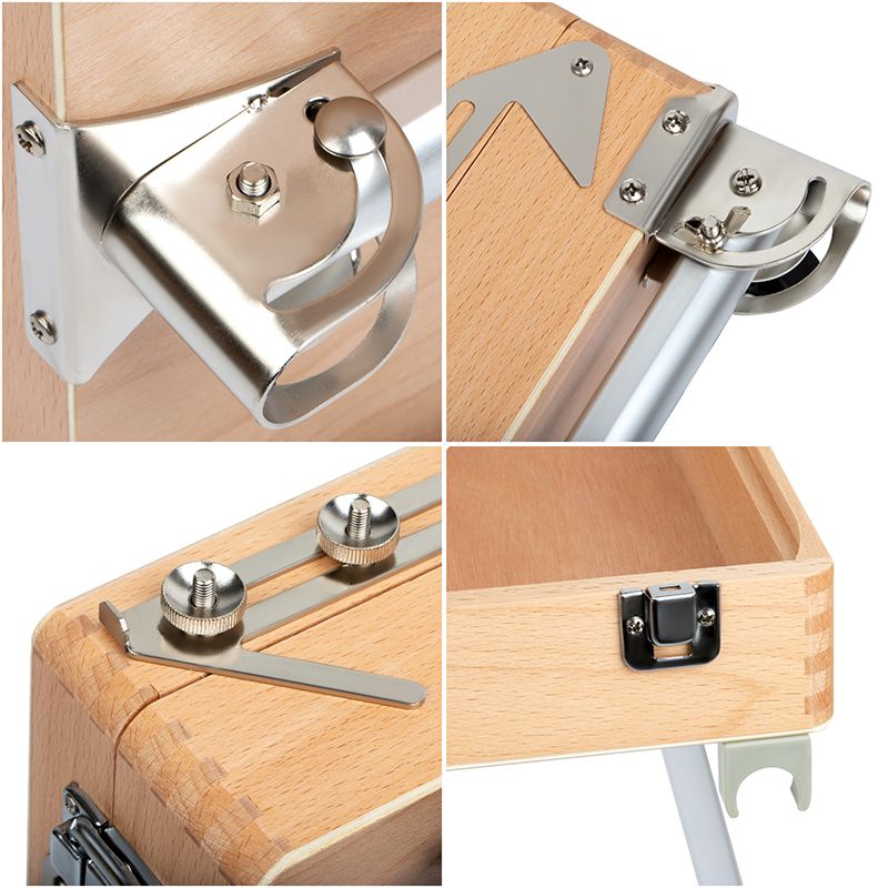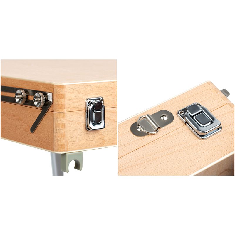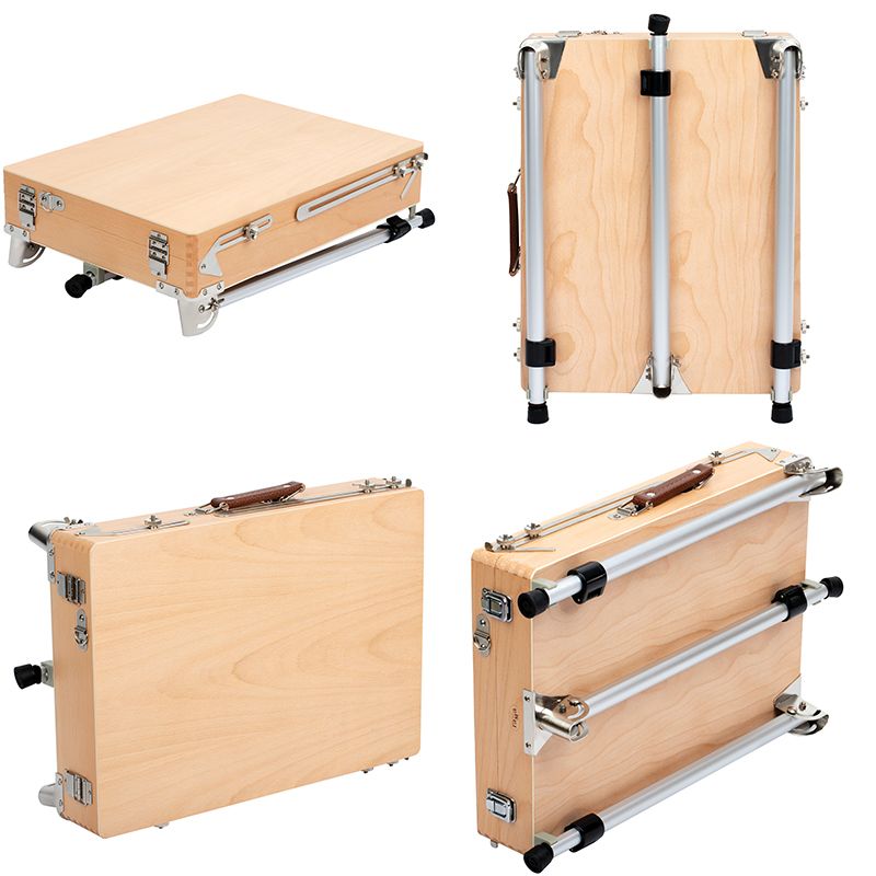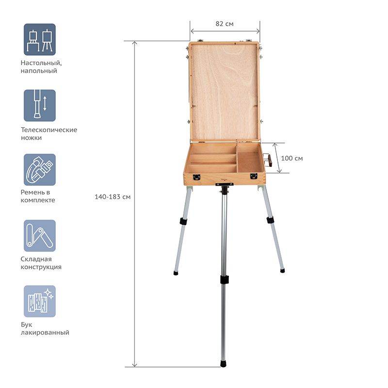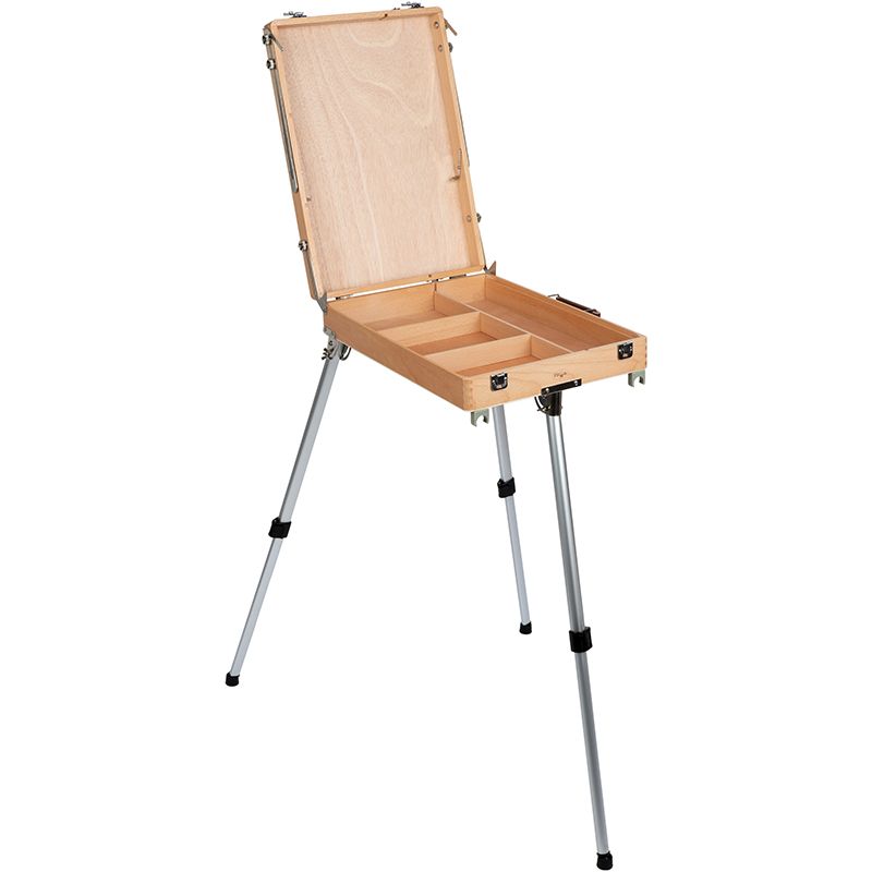 Этюдник оснащён ящиком для хранения художественных материалов. Также в комплект входит палитра. Этюдник может быть трансформирован в настольную модель. Он компактен и снабжён ручкой для переноса, поэтому его удобно хранить и брать с собой. Изготовлен из лакированного бука. Ножки выполнены из алюминия