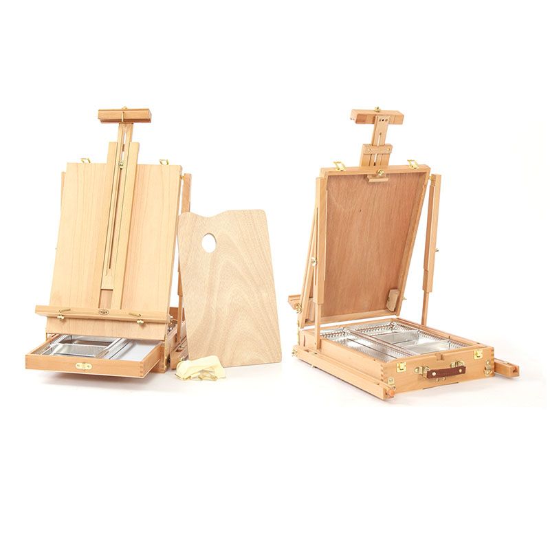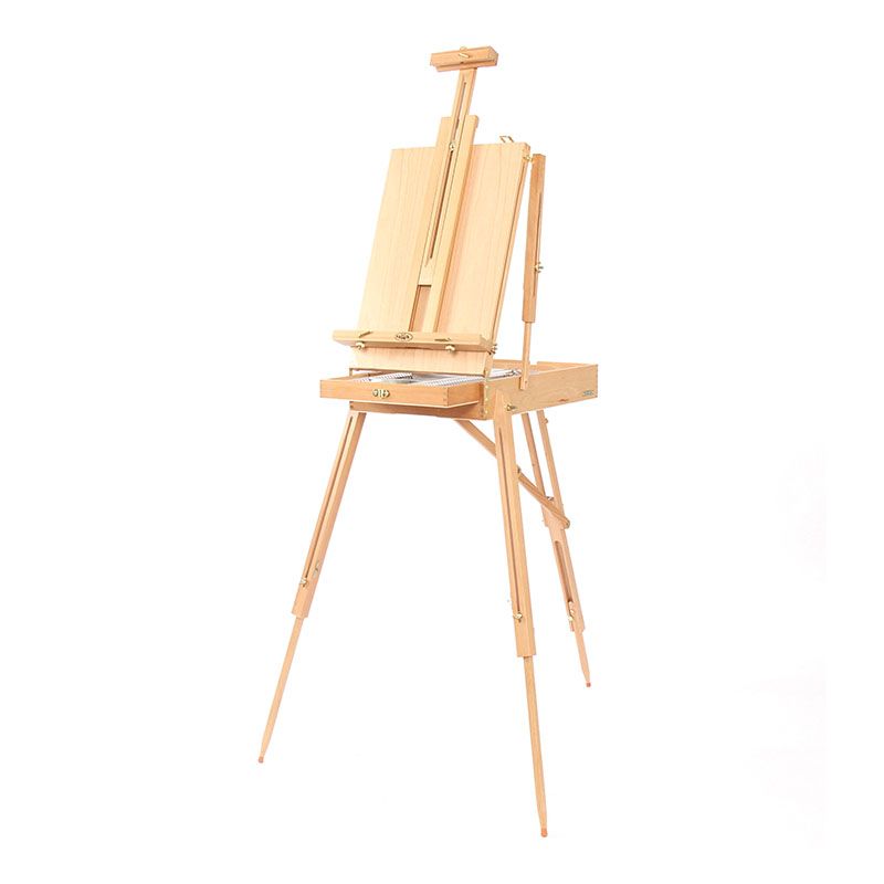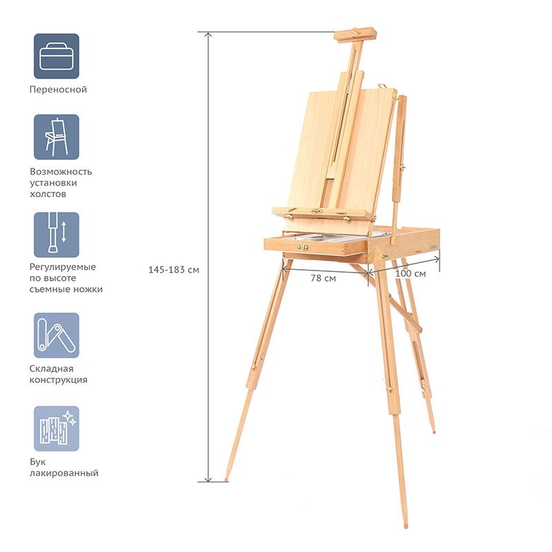 Этюдник оснащён выдвижным ящиком с металлической обивкой и модульной системой перегородок для хранения художественных материалов. Также в комплект входит палитра. Деревянные ножки регулируются по высоте, простая система крепления позволяет надёжно зафиксировать холст. Изготовлен из лакированного бука.