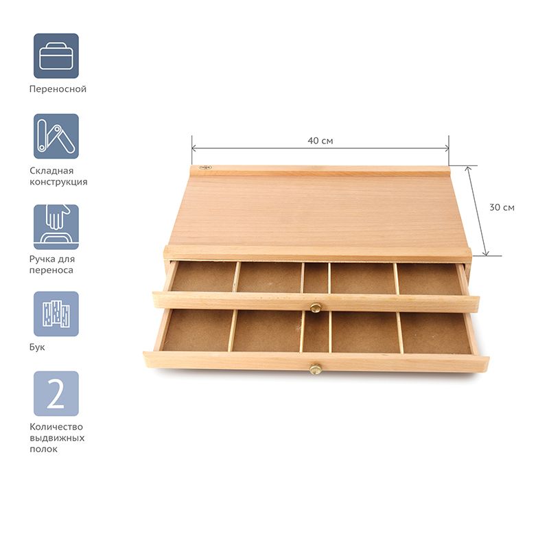 Сохраняет порядок на рабочем месте и не позволяет мелкам крошиться и осыпаться. Этюдник оснащён 2-мя выдвижными лотками с разделителями на зоны для сортировки мелков по типам и цветам. Изготовлен из лакированного бука.