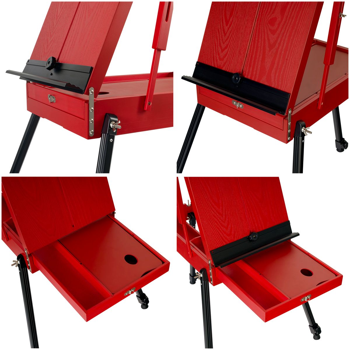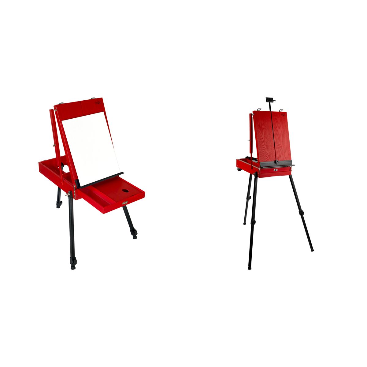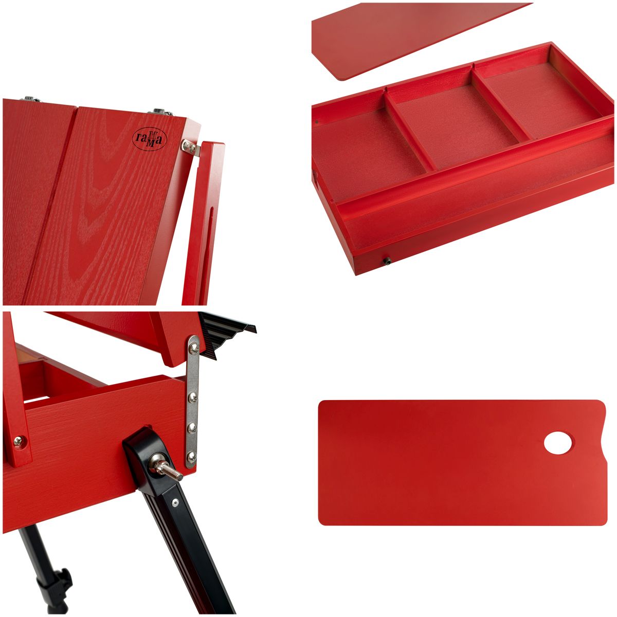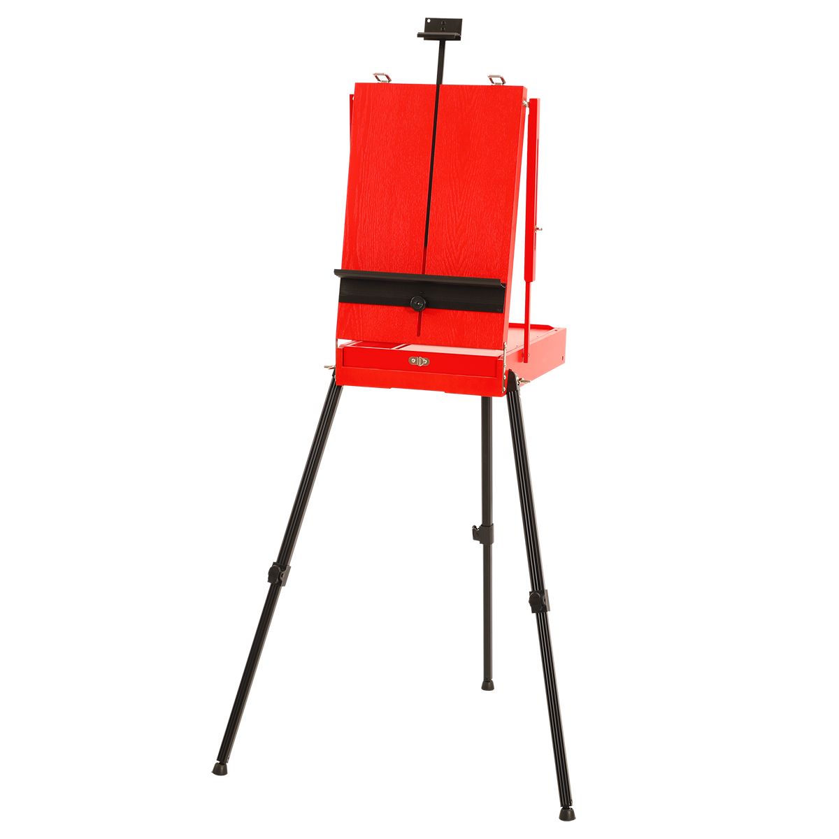 Этюдник изготовлен из сосны и окрашен в стильный красный цвет. Ножки выполнены из алюминия. Модель оснащена ящиком для хранения художественных материалов. Также в комплект входит палитра. Этюдник может быть трансформирован в настольную модель. Он легкий и компактный, снабжен ручкой и ремнем для переноса, поэтому его удобно хранить и брать с собой на пленэры.