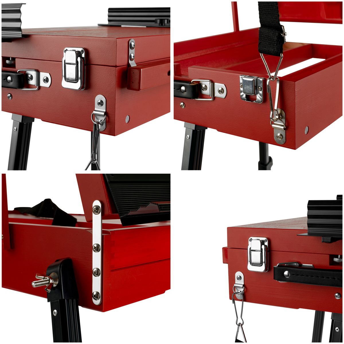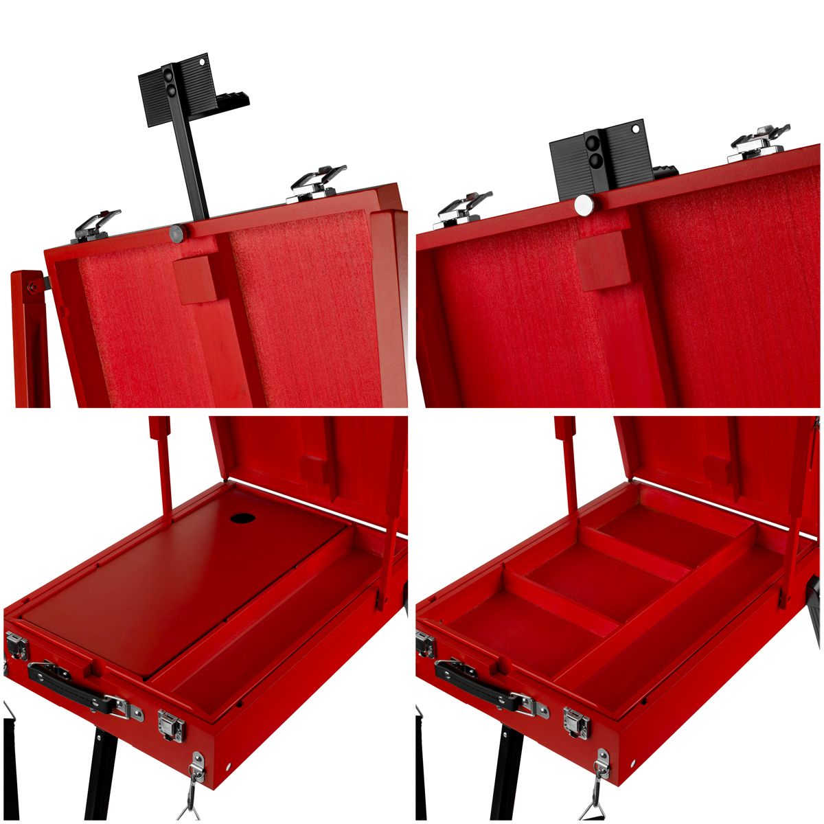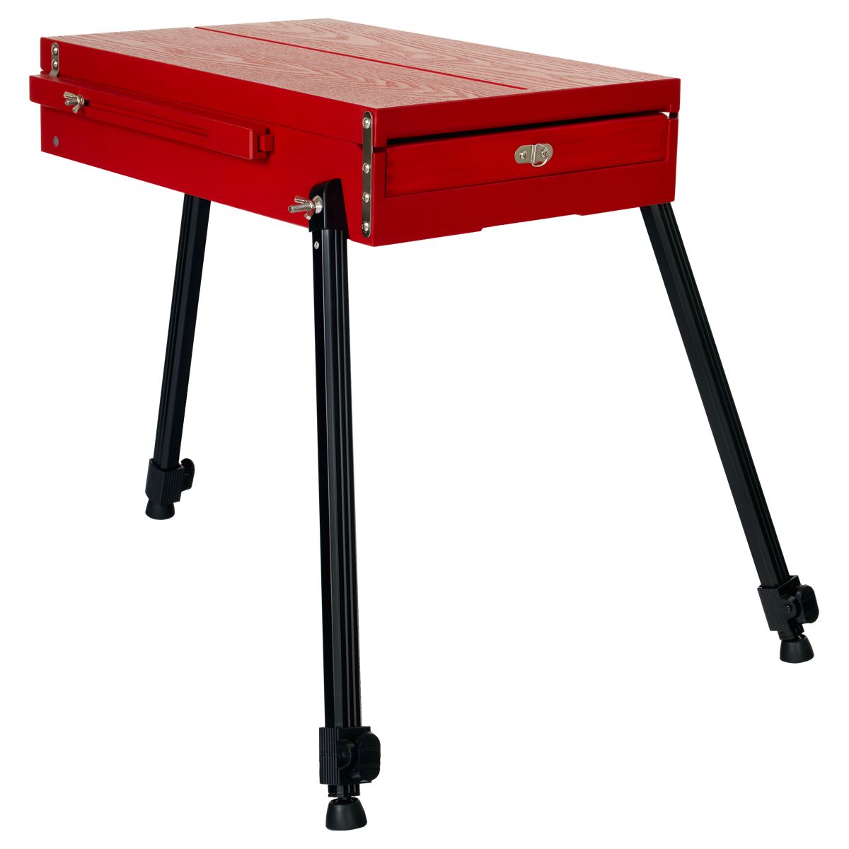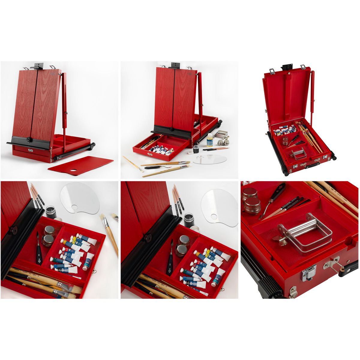 Этюдник изготовлен из сосны и окрашен в стильный красный цвет. Ножки выполнены из алюминия. Модель оснащена ящиком для хранения художественных материалов. Также в комплект входит палитра. Этюдник может быть трансформирован в настольную модель. Он легкий и компактный, снабжен ручкой и ремнем для переноса, поэтому его удобно хранить и брать с собой на пленэры.