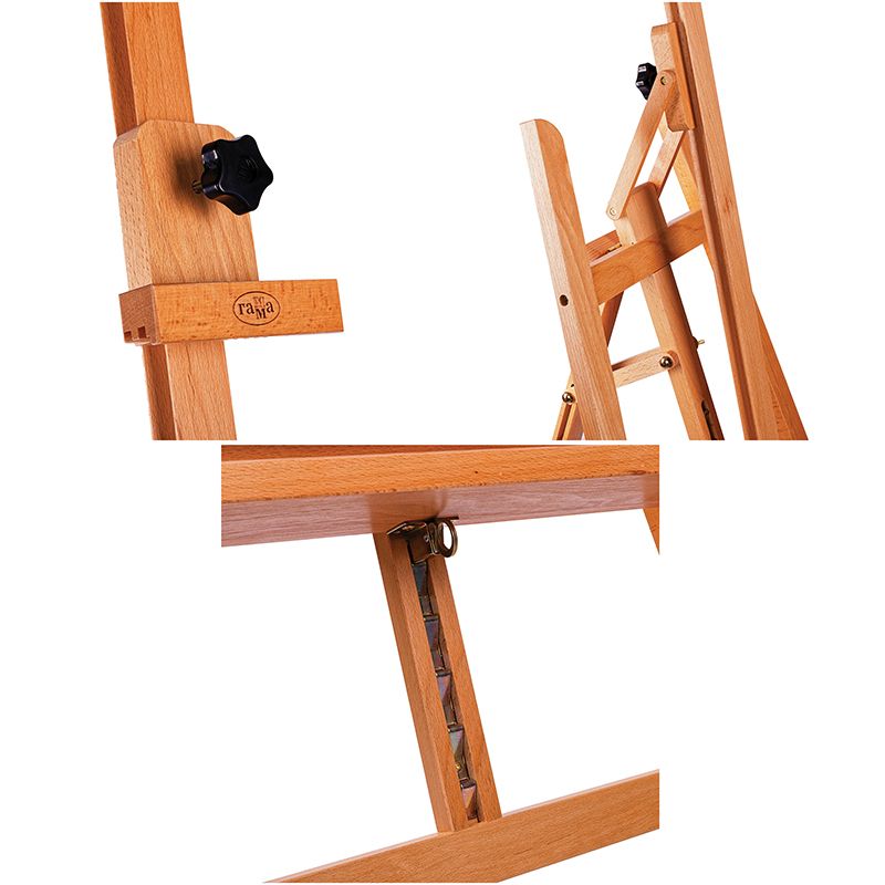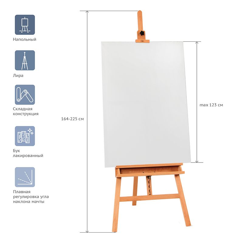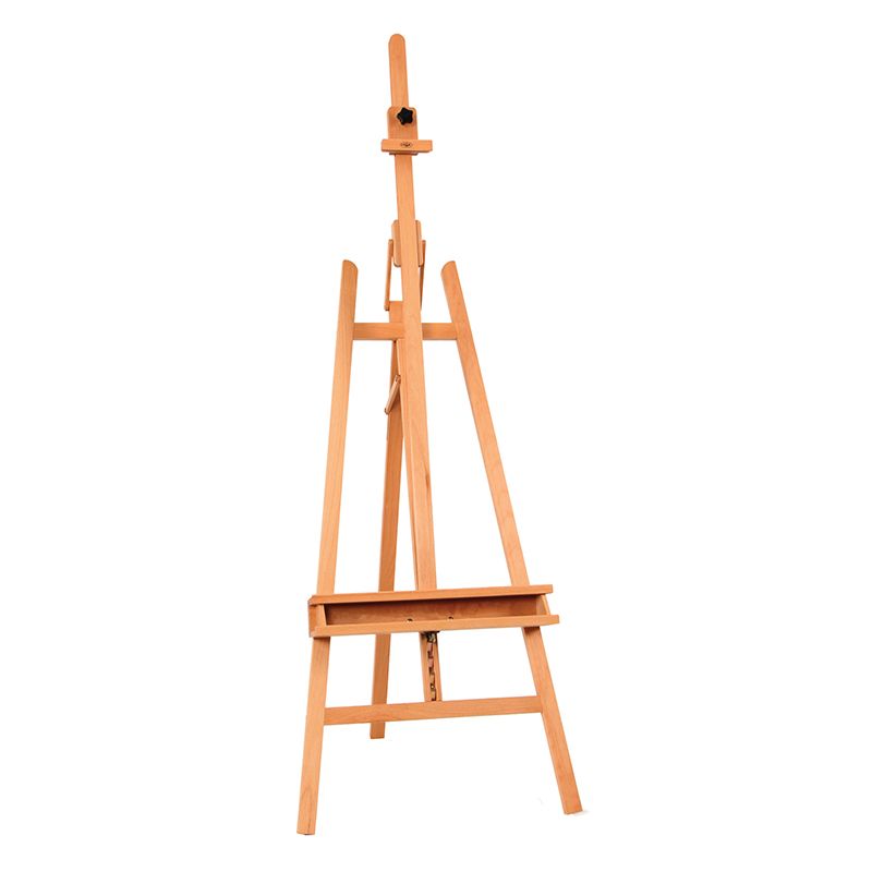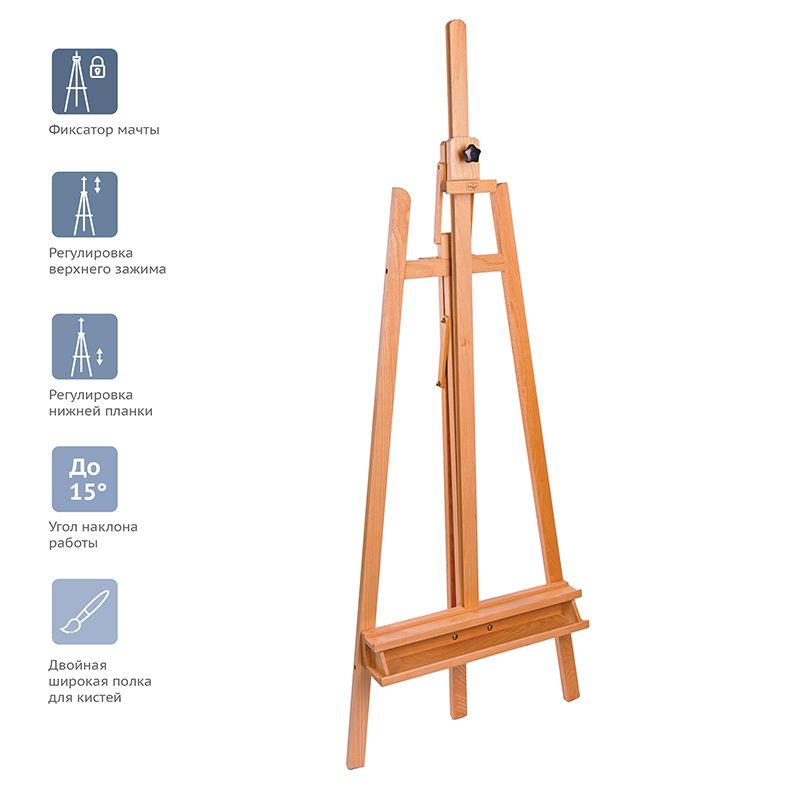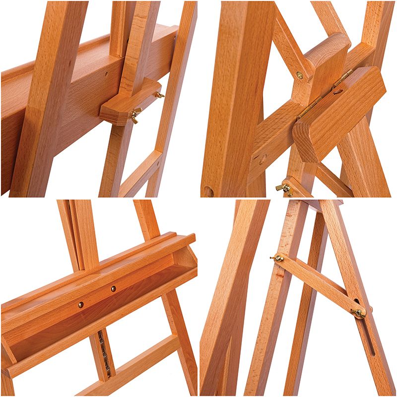 Мольберт с механизмом плавного опускания позволяет менять положение работы одним движением, не снимая холст с мольберта. Верхний держатель мольберта надежно фиксирует холст, а благодаря наклонной штанге с отрицательным углом работу можно опустить на себя до 15°, чтобы прорисовать мелкие детали и защитить свежую краску от пыли. Изготовлен из лакированного бука. Оснащён двойной широкой полкой для хранения кистей. Мольберт складывается и не занимает много места при хранении. Поставляется в разборе, а в комплекте есть инструкция по сборке.
