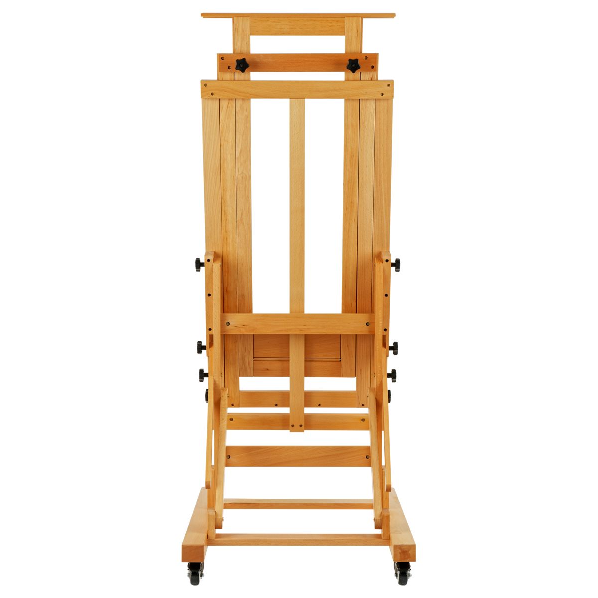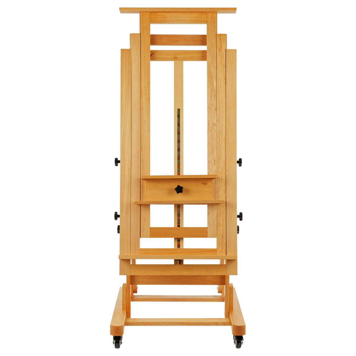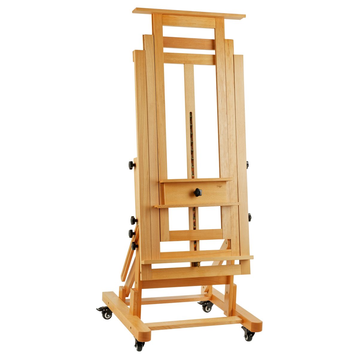 Мольберт оснащён механизмом изменения угла наклона. В стандартном положении удобно работать с акрилом и маслом, а в горизонтальном — акварелью. Мольберт оснащен механизмом плавного опускания, поэтому мольберт легко регулировать под любой рост. Изготовлен из лакированного бука. Мольберт оснащен колесиками с тормозным механизмом для легкого перемещения по студии. Благодаря широкому основанию, мольберт устойчив при работе с большими форматами.
