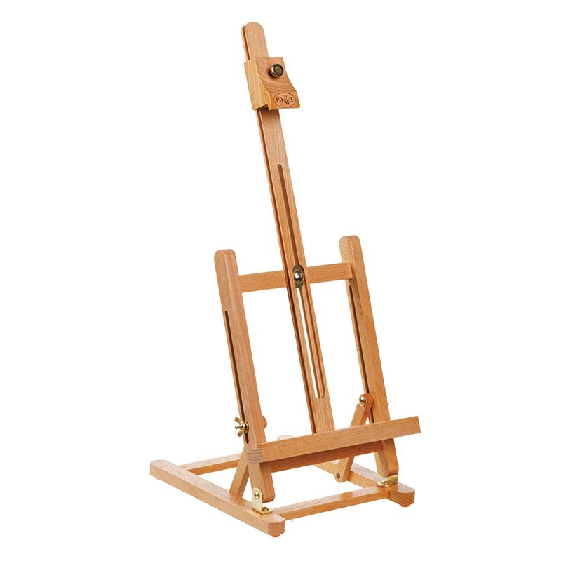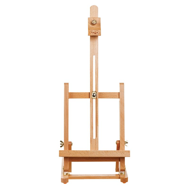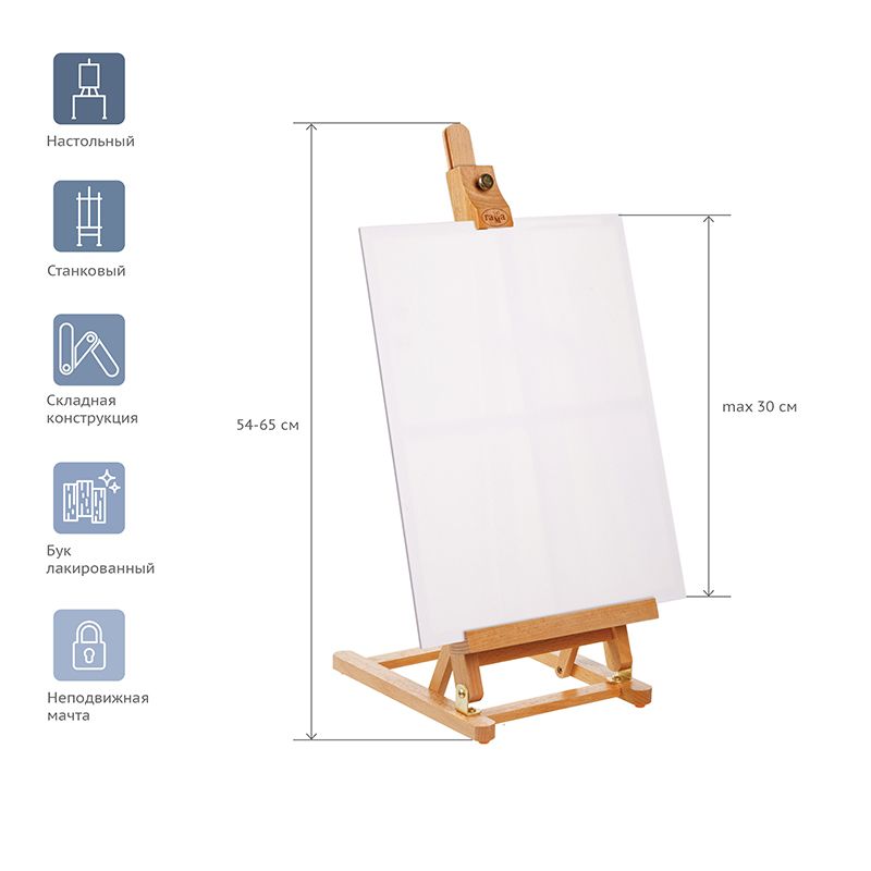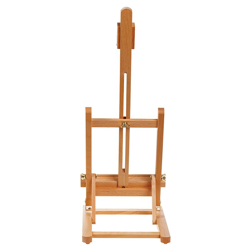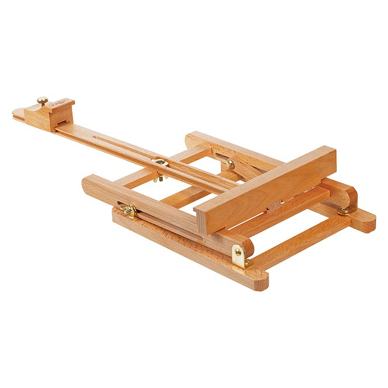 Верхний держатель мольберта надёжно фиксирует холст. Мольберт имеет плавную регулировку угла наклона и оснащён полкой-упором для холстов и планшетов. Он подходит начинающим и профессиональным художникам. Изготовлен из лакированного бука. Удобно хранить в сложенном виде.