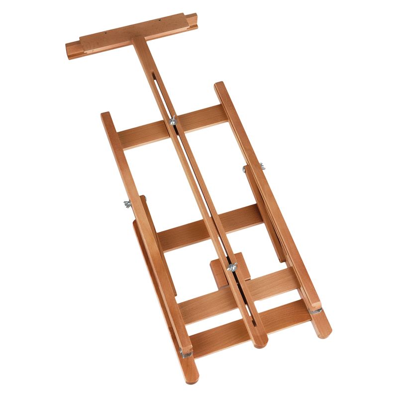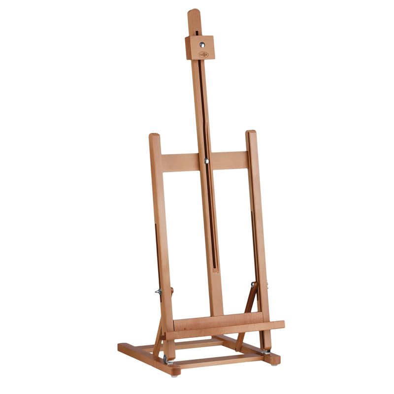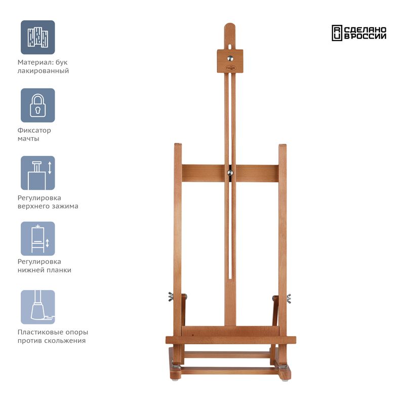 Верхний фиксатор регулируется по высоте и надёжно удерживает холст. Изготовлен из лакированного бука. Пластиковые опоры на основании препятствуют скольжению. Мольберт удобно хранить в сложенном виде. Имеет складную конструкцию.
