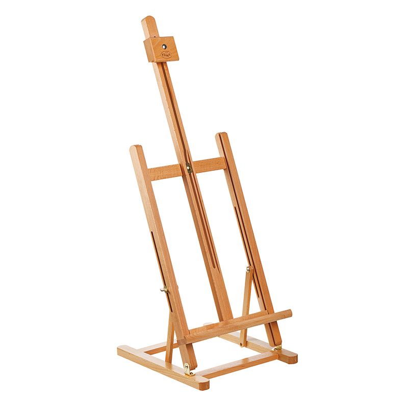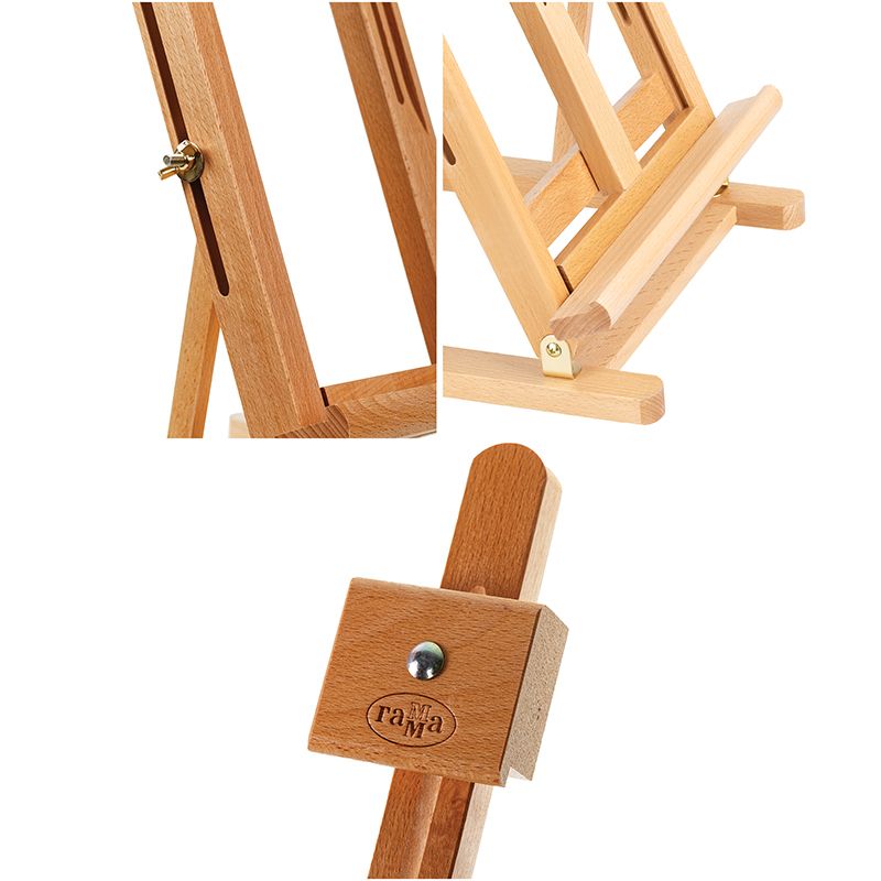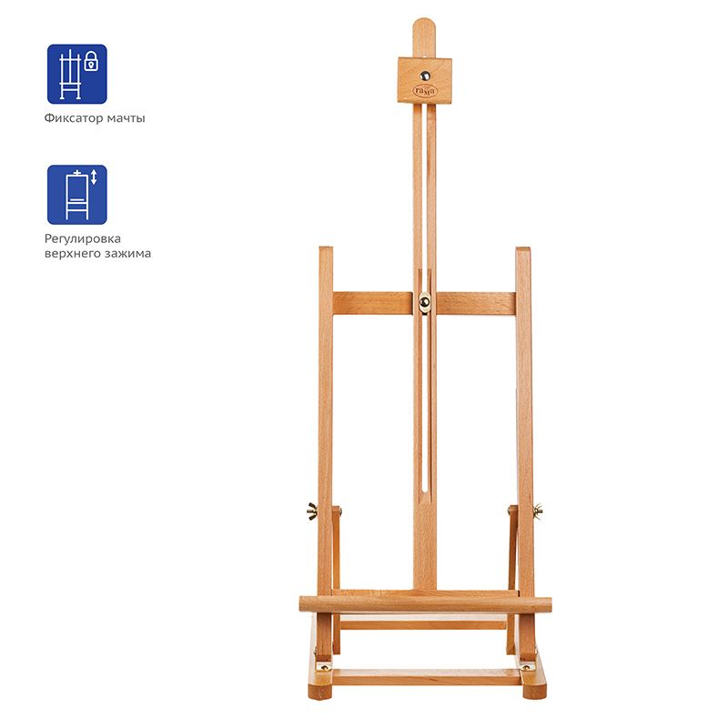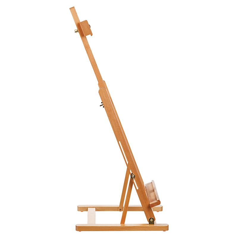 Мачту можно наклонить на себя для проработки мелких деталей или сушки работ. Верхний фиксатор регулируется по высоте и надёжно удерживает холст. Изготовлен из лакированного бука. Пластиковые опоры на основании препятствуют скольжению. Мольберт удобно хранить в сложенном виде. Имеет складную конструкцию.