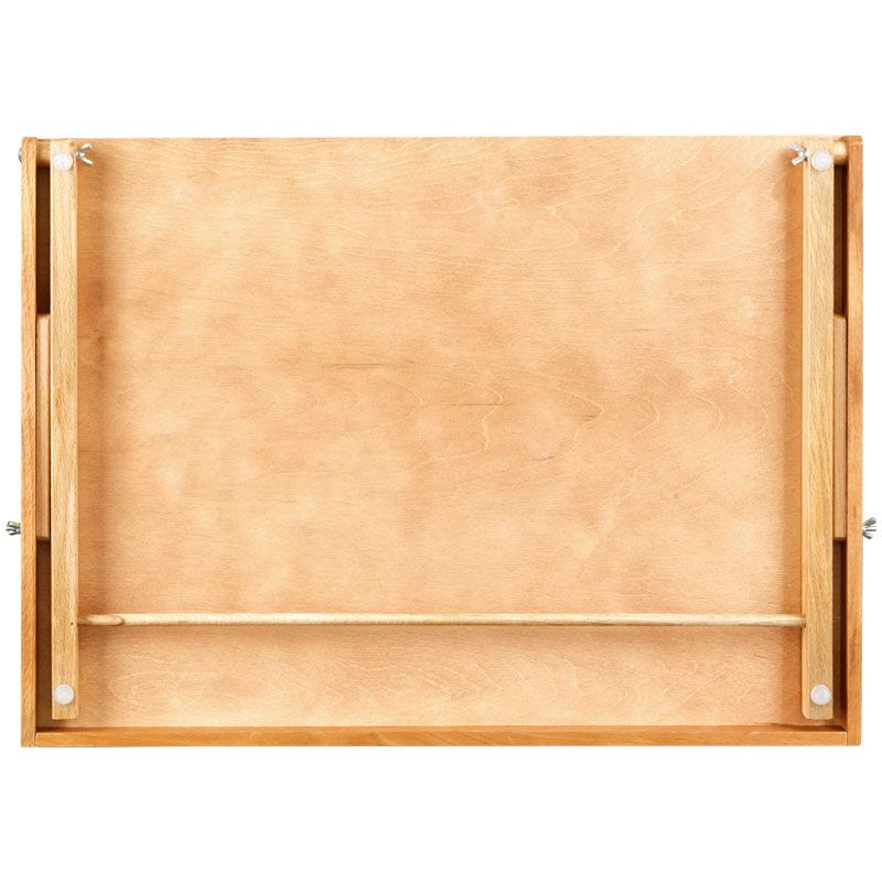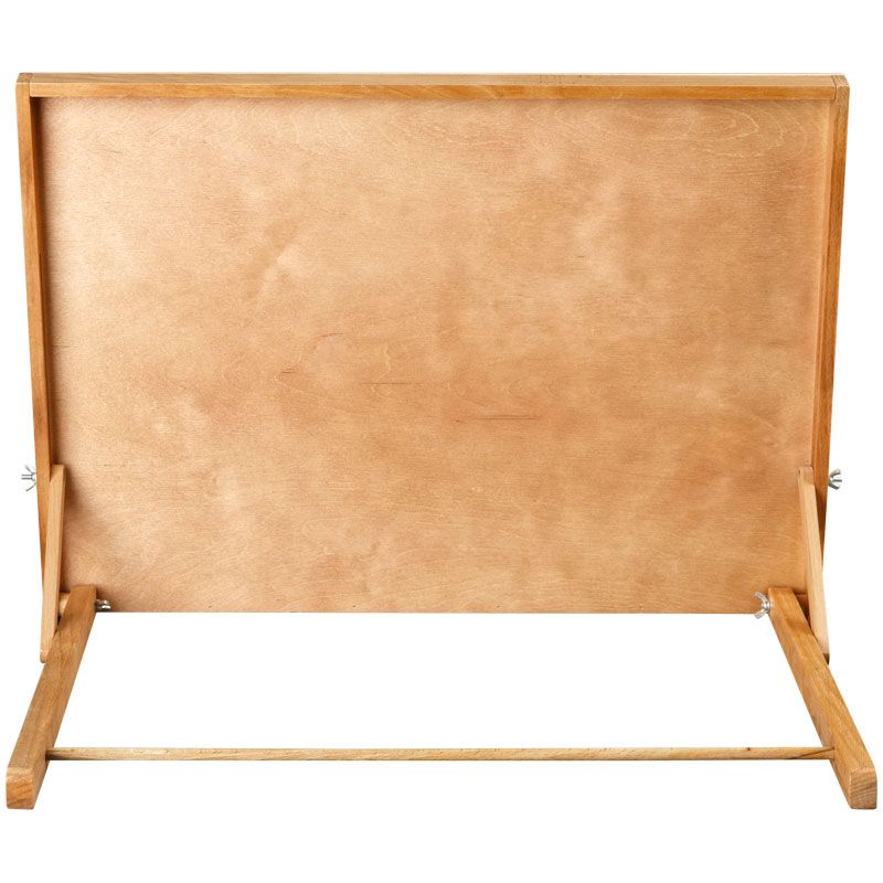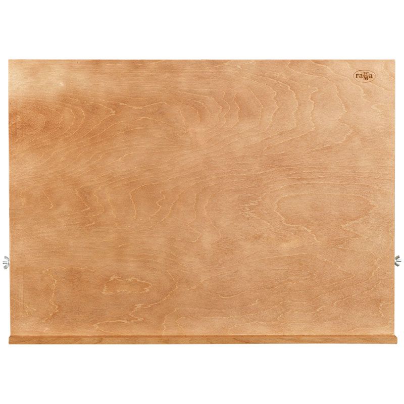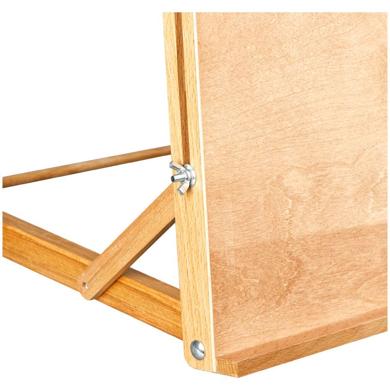 Плавная регулировка угла наклона рабочей поверхности позволяют работать с любым видом красок. Мольберт изготовлен из российского розового бука. Удобно хранить в сложенном виде.
