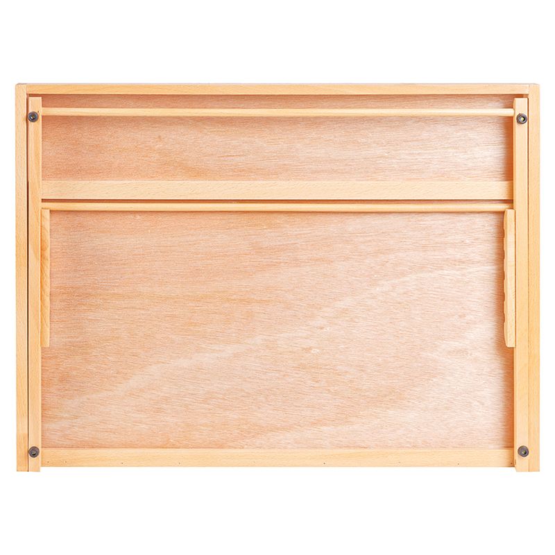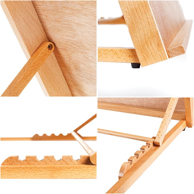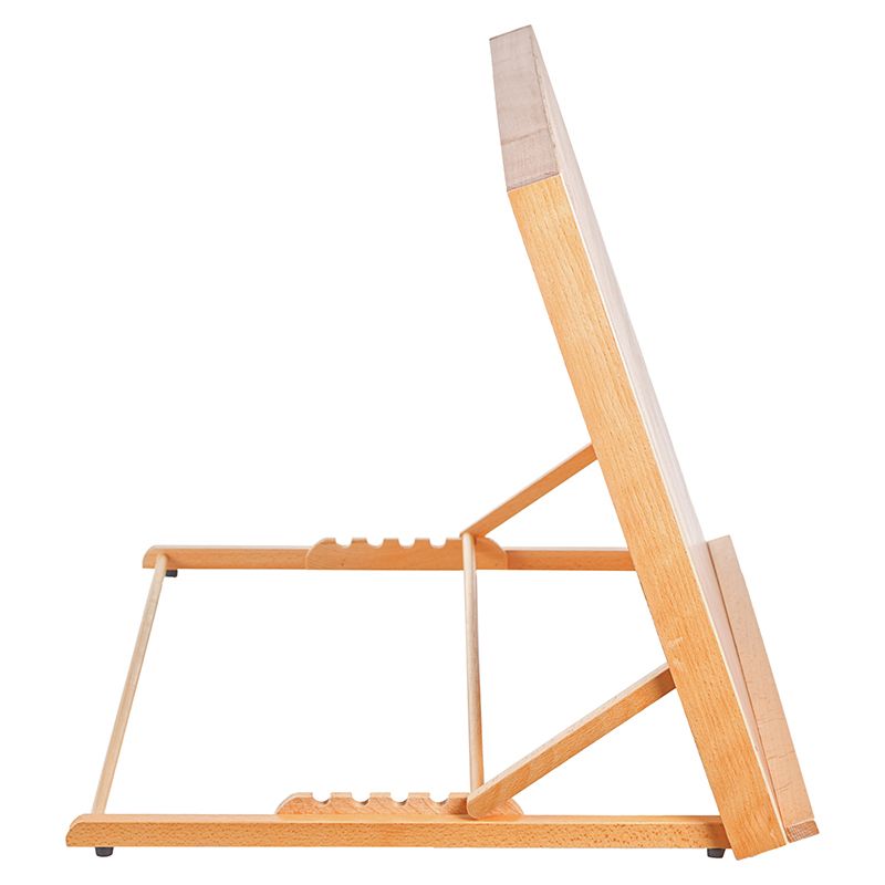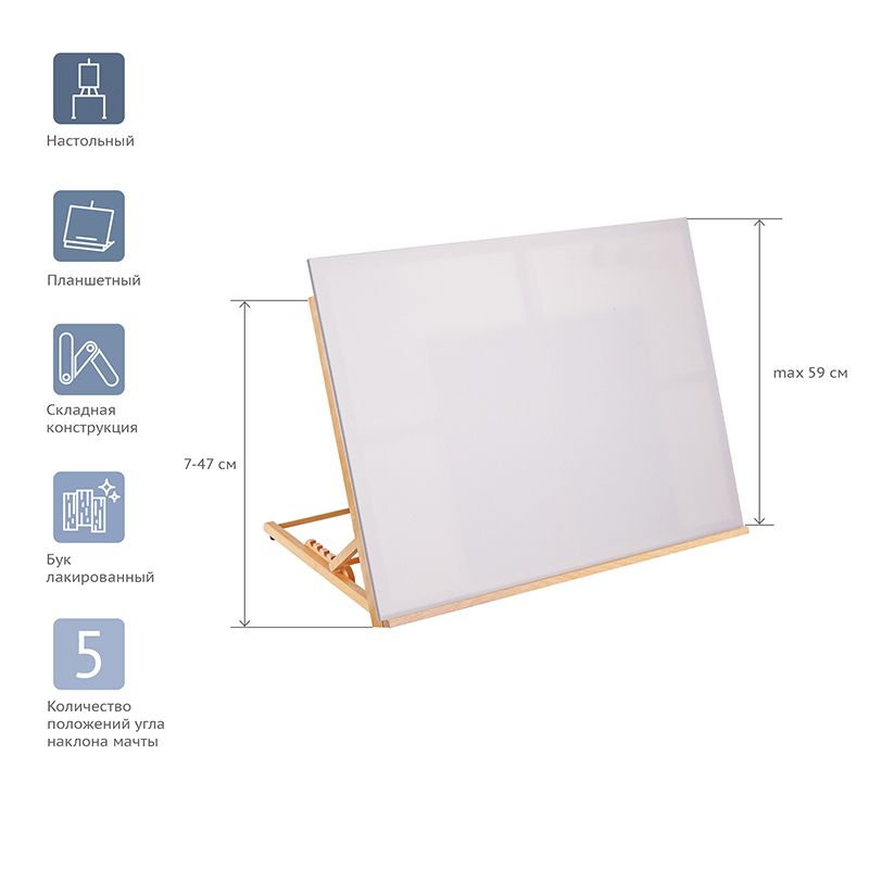 Пять положений угла наклона полотна позволяют работать с любым видом красок. Мольберт изготовлен из лакированного бука. Удобно хранить в сложенном виде.