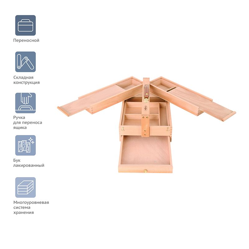 Оснащён многоуровневой системой хранения с выдвижным ящиком для кистей и красок. Снабжён ручкой для переноса, поэтому его удобно хранить и брать с собой. Изготовлен из лакированного бука.