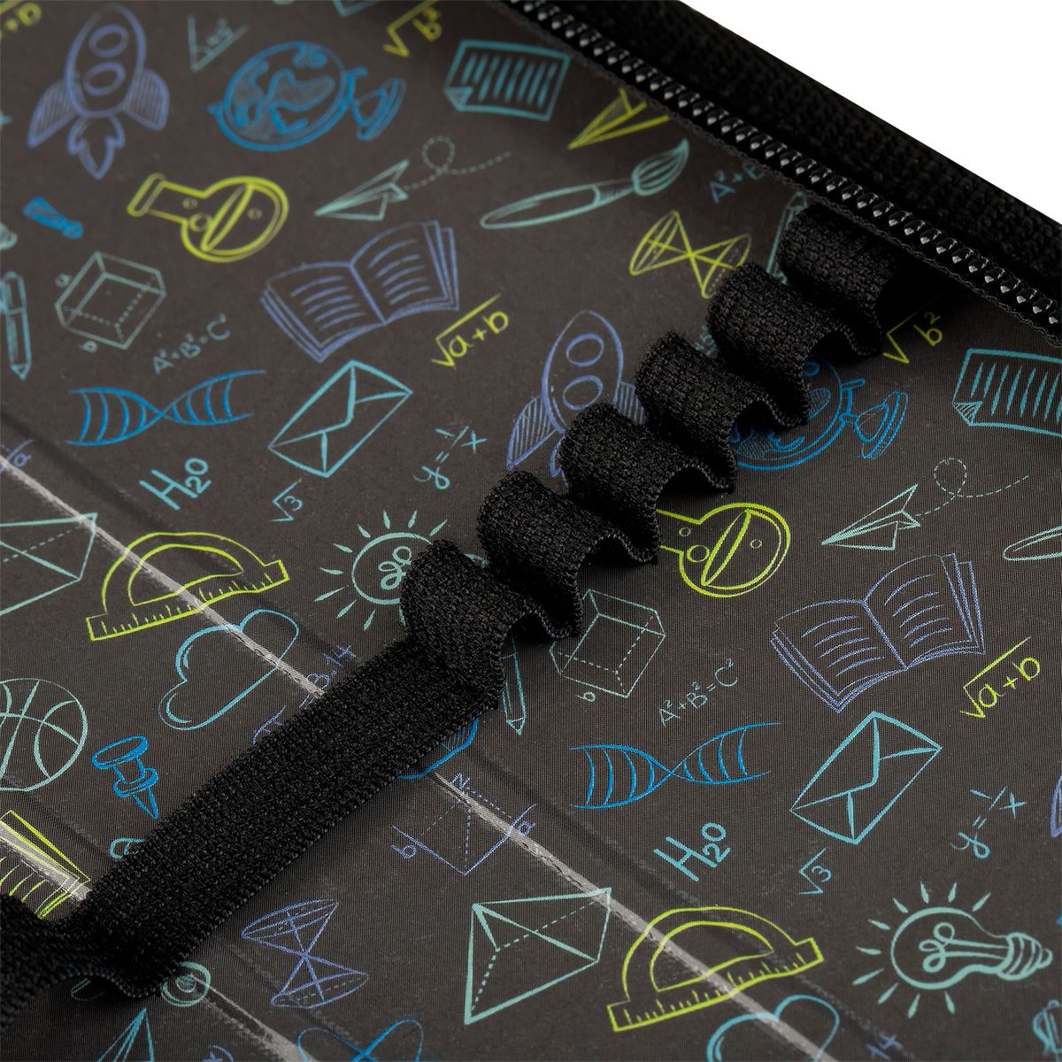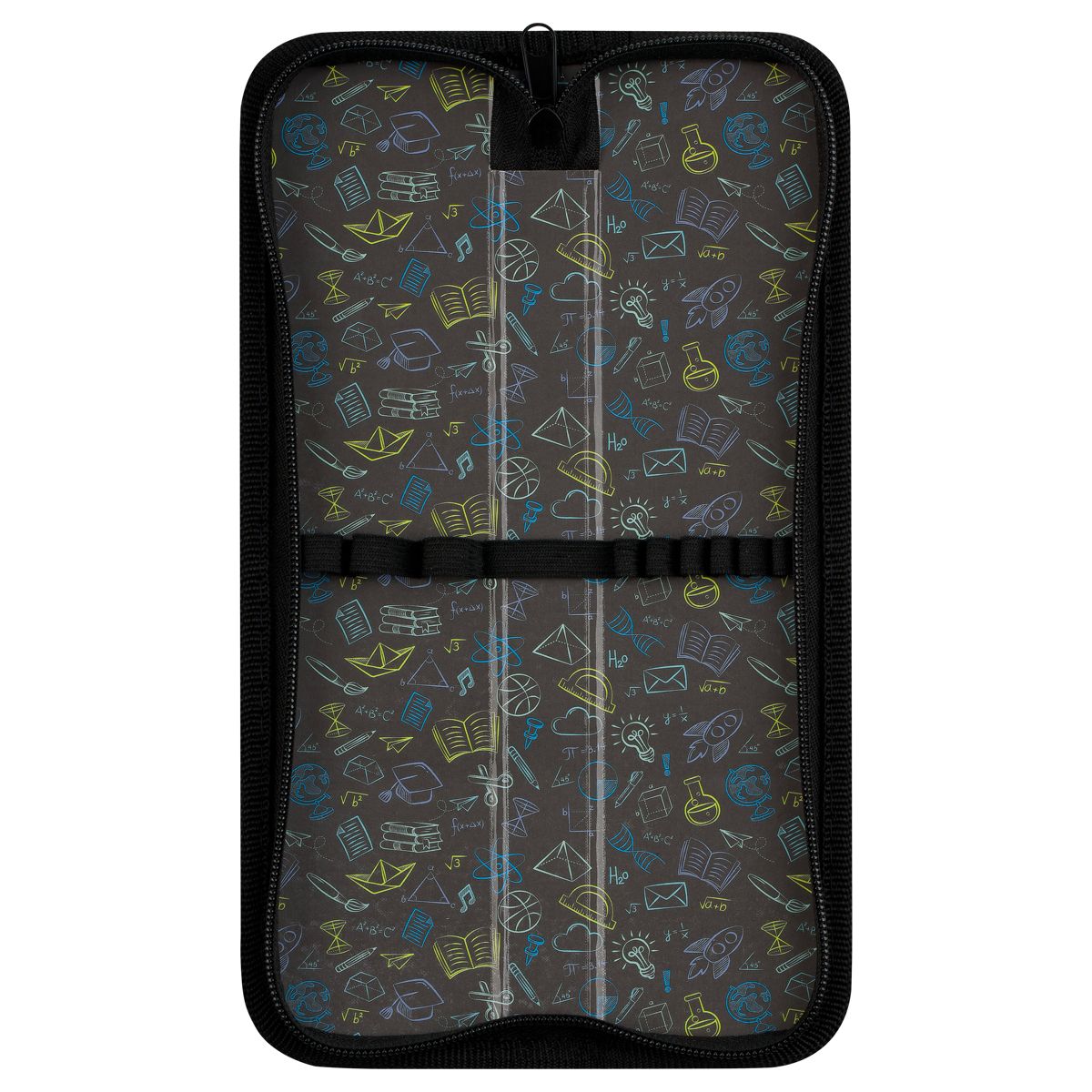 Резинки на каждой створке позволяют поддерживать порядок внутри пенала. Материал внешней и внутренней стороны – ламинированный картон. Есть детали из текстиля.