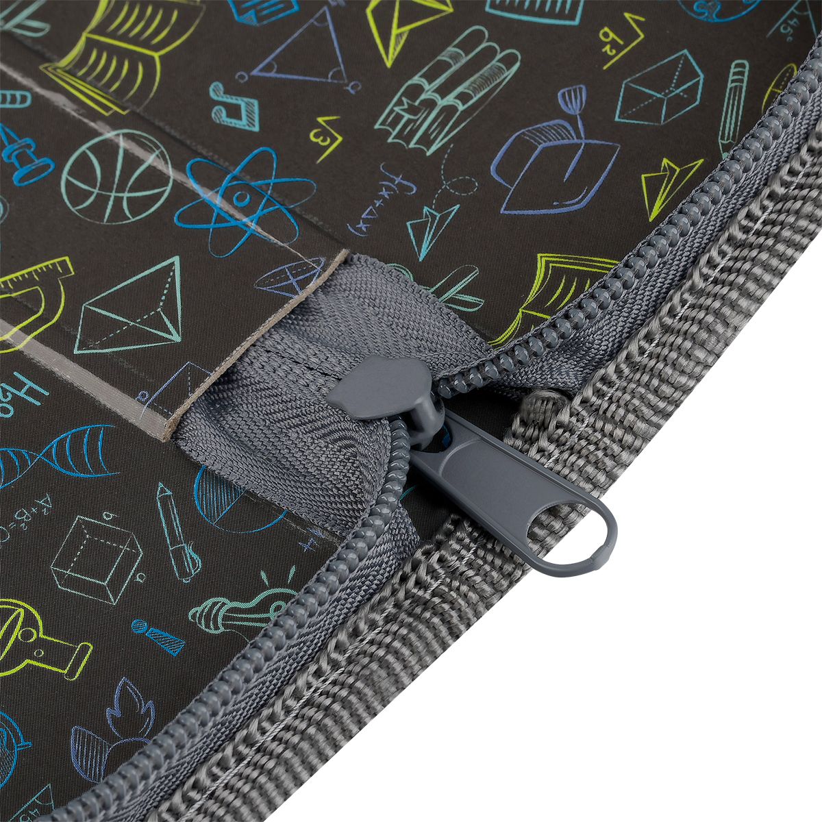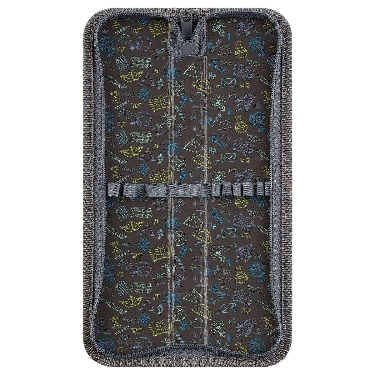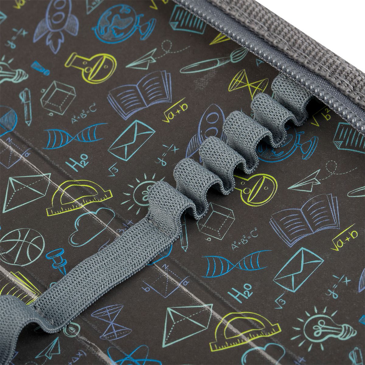 Резинки на каждой створке позволяют поддерживать порядок внутри пенала. Материал внешней и внутренней стороны – ламинированный картон. Есть детали из текстиля.