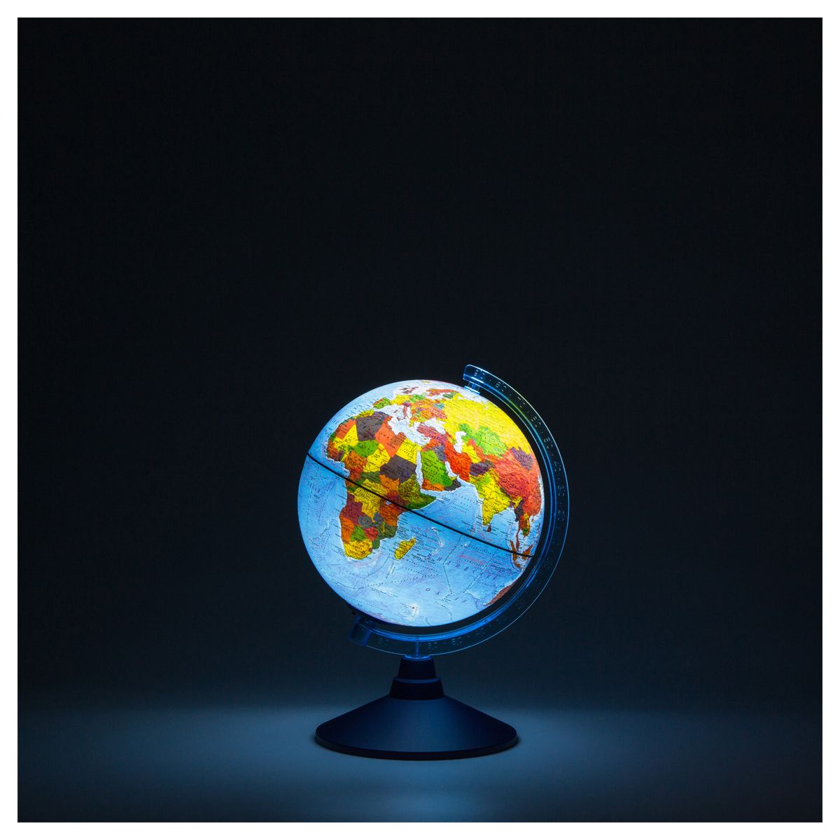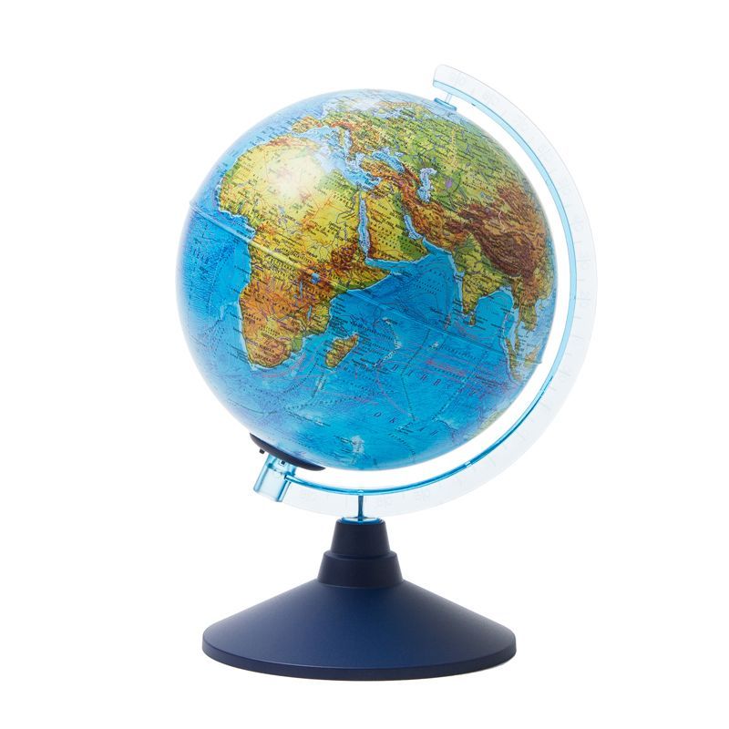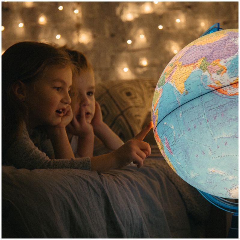 Компактный размер глобуса 21 см удобен для размещения на рабочем столе. Карта глобуса максимально подробная, все надписи легко читаются. Глобус имеет подсветку, что позволяет комфортно использовать его в темное время суток. Подсветка от батареек абсолютно безопасна – можно использовать глобус в качестве ночника. Подсветка работает от двух батареек АА, в комплект с глобусом не входят. Использованные батарейки внутри сферы при необходимости легко заменить.