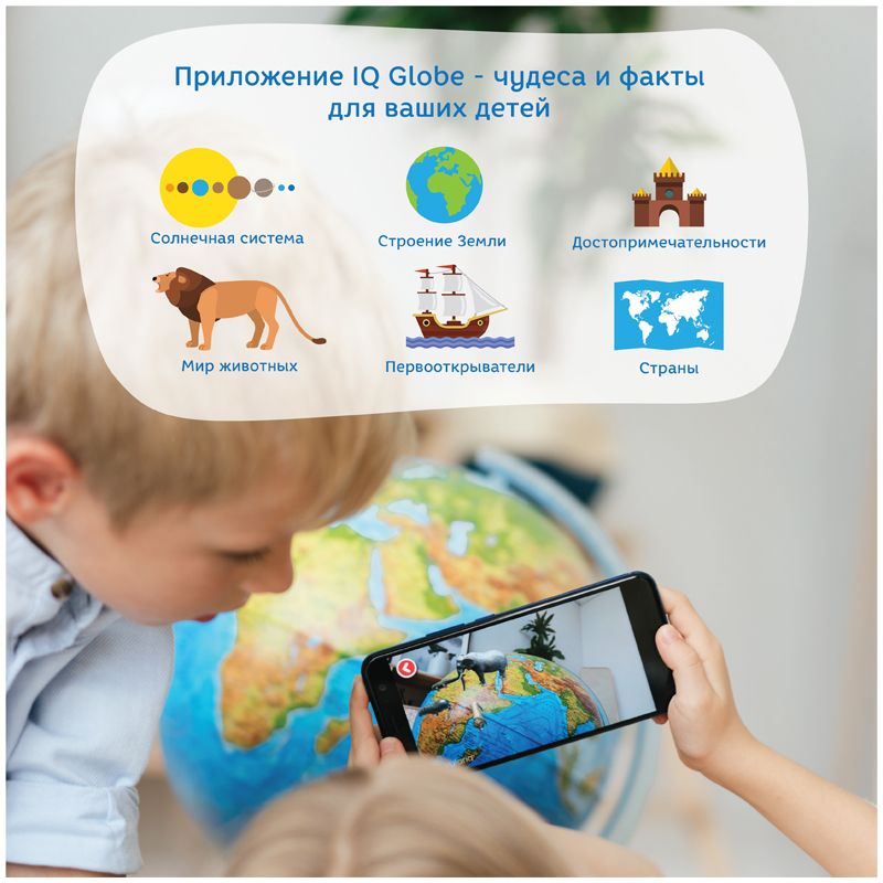 А когда наскучит рассматривать глобус самому, можно скачать на свой смартфон или планшет бесплатное приложение IQ Globe, и совершить настоящее путешествие по нашей планете и бескрайнему космосу вместе с героями интерактивного глобуса любознательными Аришей, Тёмой и Митей и их питомцами Астором и Ириской. С помощью функции дополненной реальности вы сможете полететь в космос и рассмотреть поближе каждую из планет Солнечной системы, попасть в любую точку земного шара, познакомиться с необычными животными и растениями, покрутить со всех сторон мировые достопримечательности и это далеко не все! Герои интерактивного глобуса будут сопровождать вас на всём пути и рассказывать интересные факты о каждом заинтересовавшем объекте. Все, что понадобится: