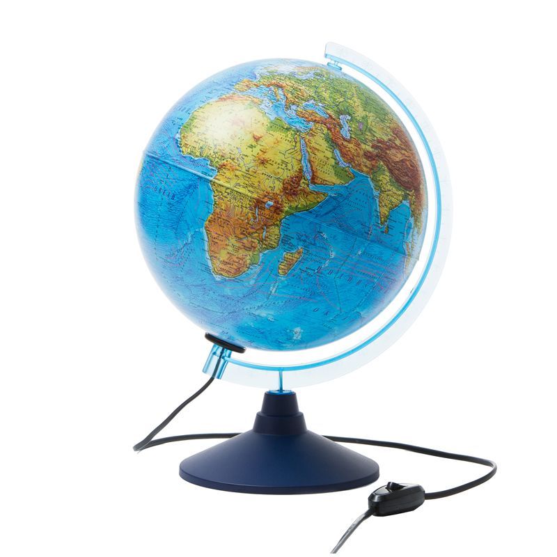 Размер глобуса 25 см, достаточно крупный с хорошо читаемыми надписями, удобен для размещения на рабочем столе. Глобус имеет подсветку, что позволяет комфортно использовать его в темное время суток. Лампочку внутри сферы при необходимости легко заменить.
