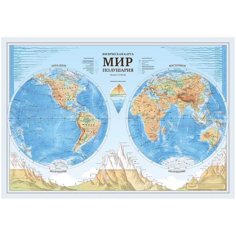 Карта "Мир. Полушария" физическая Globen, 1:37млн., 1010*690мм, с ламинацией, европодвес
