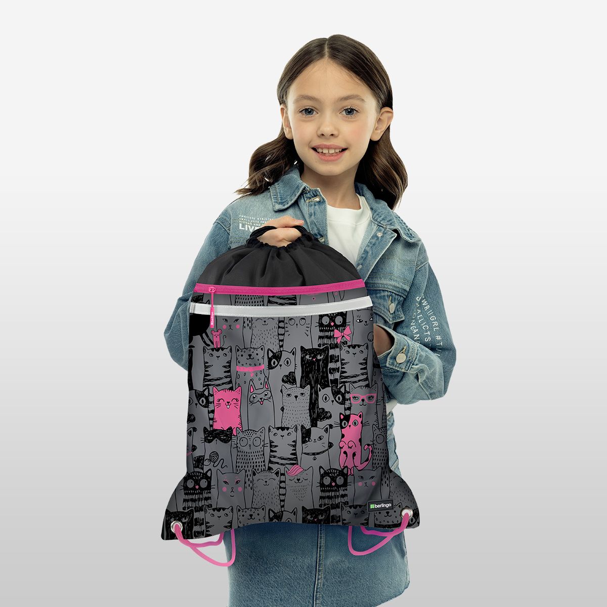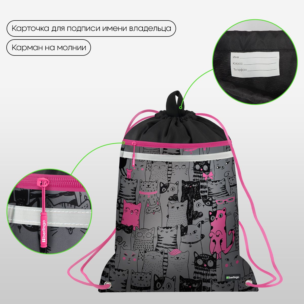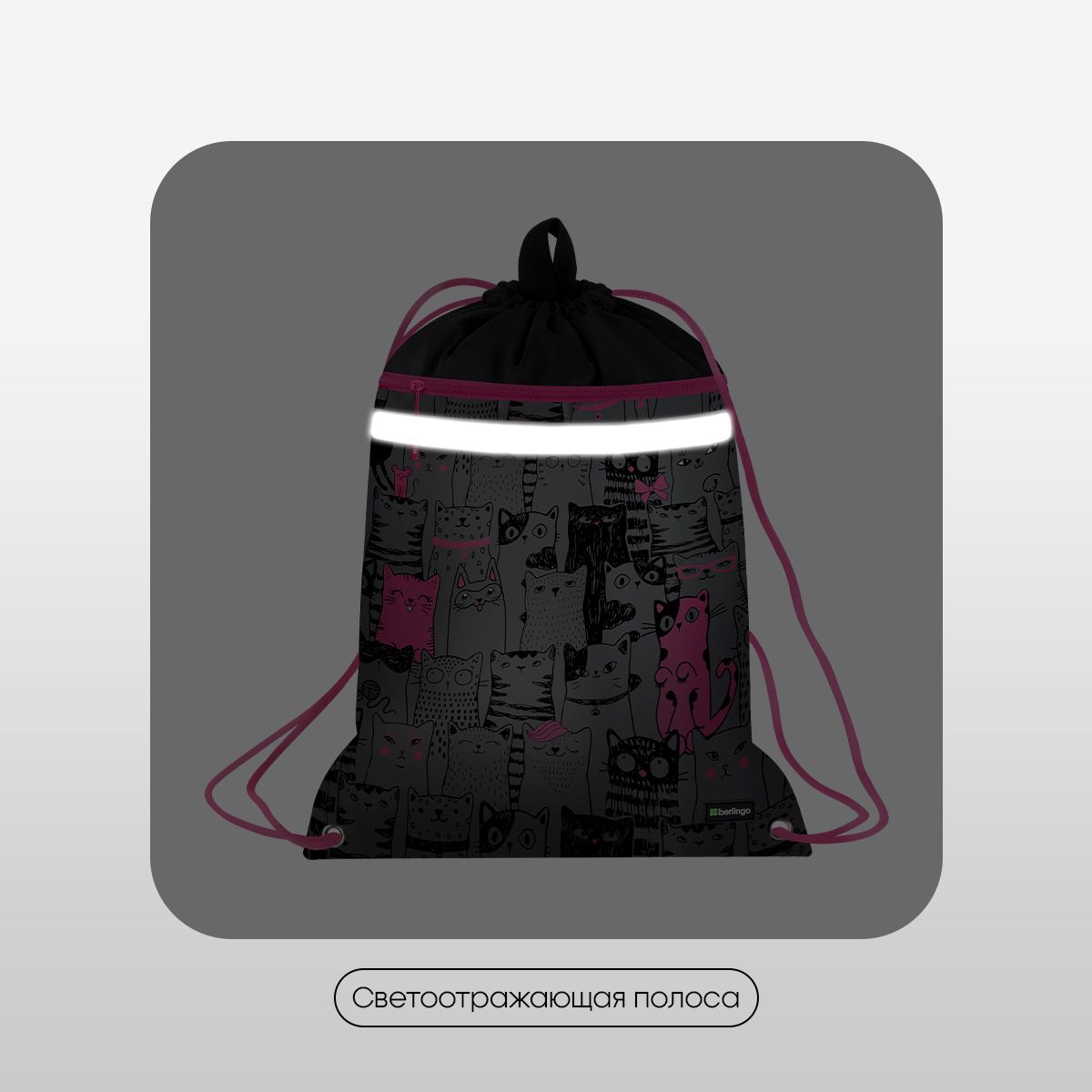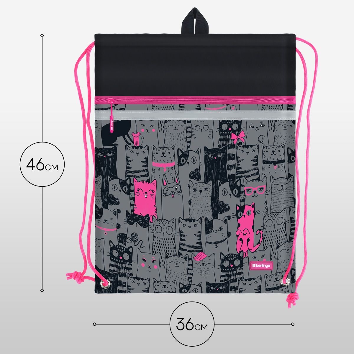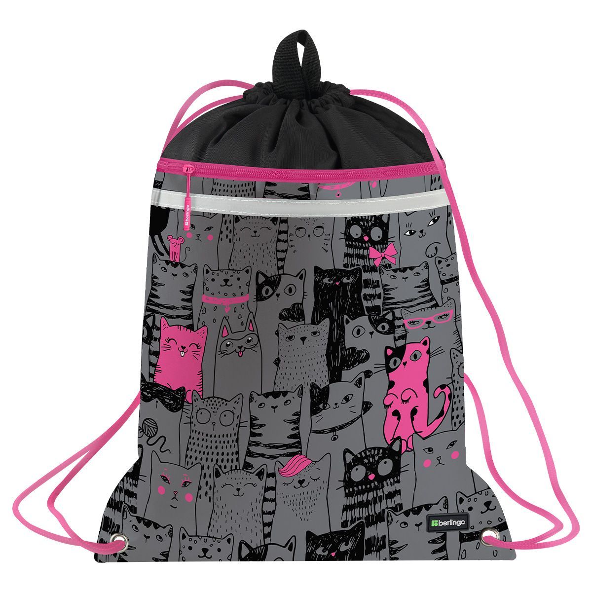 Мешок для обуви 1 отделение Berlingo "Happy Cats", 360*460мм, вентиляционная сеточка , светоотражающая лента, карман на молнии