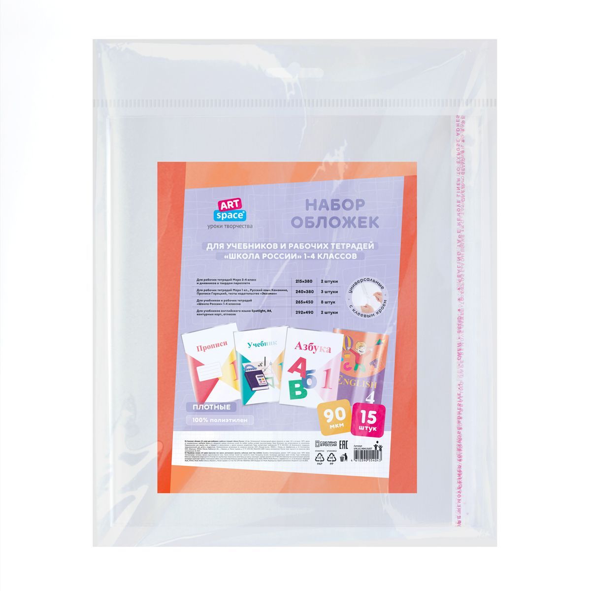 Комплект обложек (15шт.) для учебников и рабочих тетрадей "Школа России" 1-4 класса, ПЭ 90мкм, универсальные с клеевым краем, ArtSpace