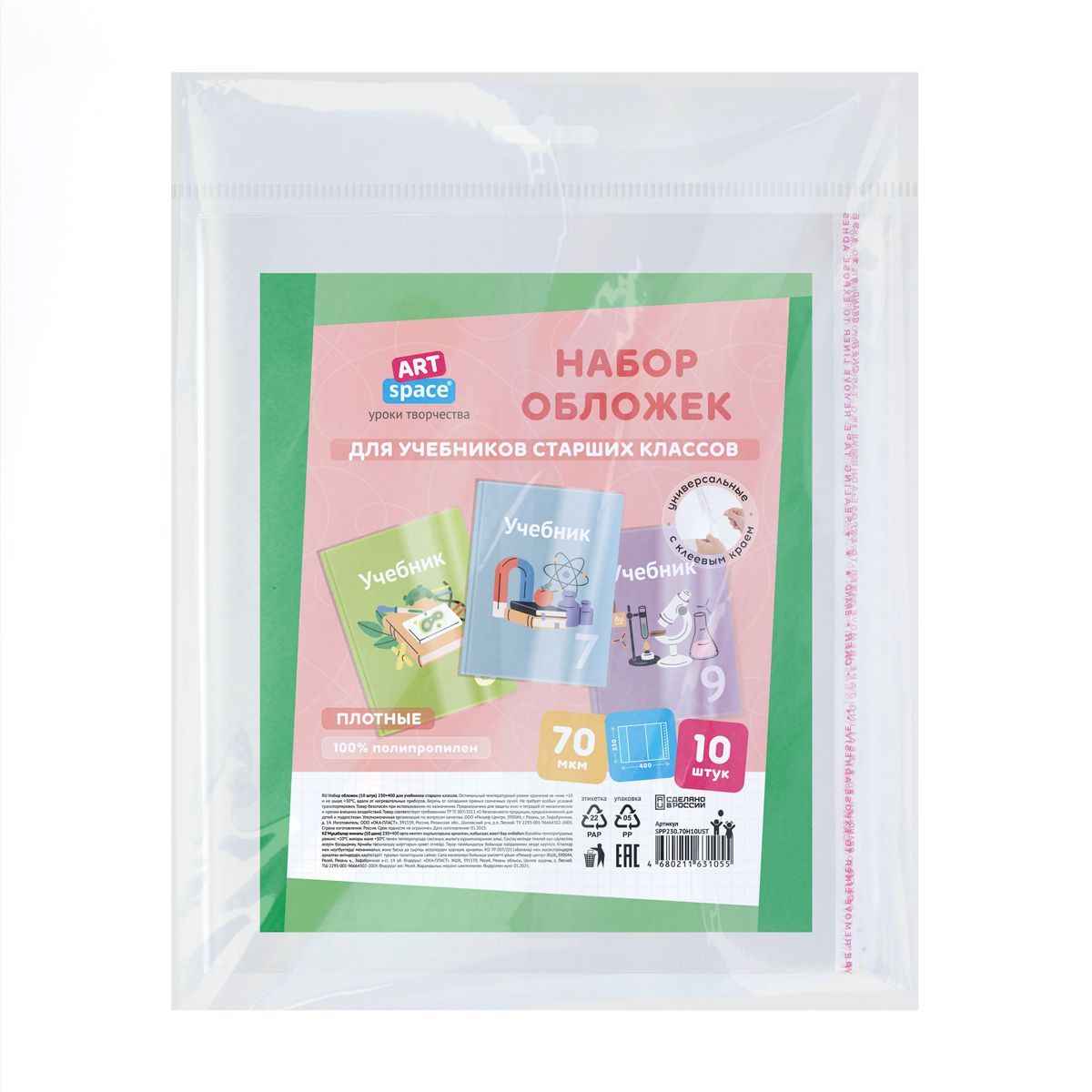 Набор обложек (10шт.) 230*400 для учебников старших классов, ПП 70мкм, универсальные с клеевым краем, ArtSpace