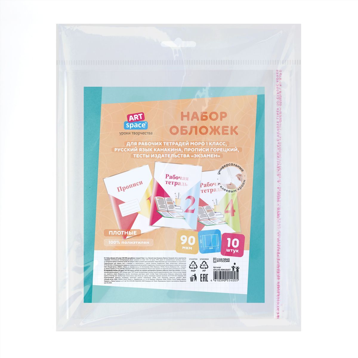 Набор обложек (10шт.) 240*380 для раб. тетр. Моро 1кл., Рус.яз. Канакина, Прописи Горецкий, тесты изд.."Экзамен", ПЭ 90мкм, унив. с кл. краем,ArtSpace