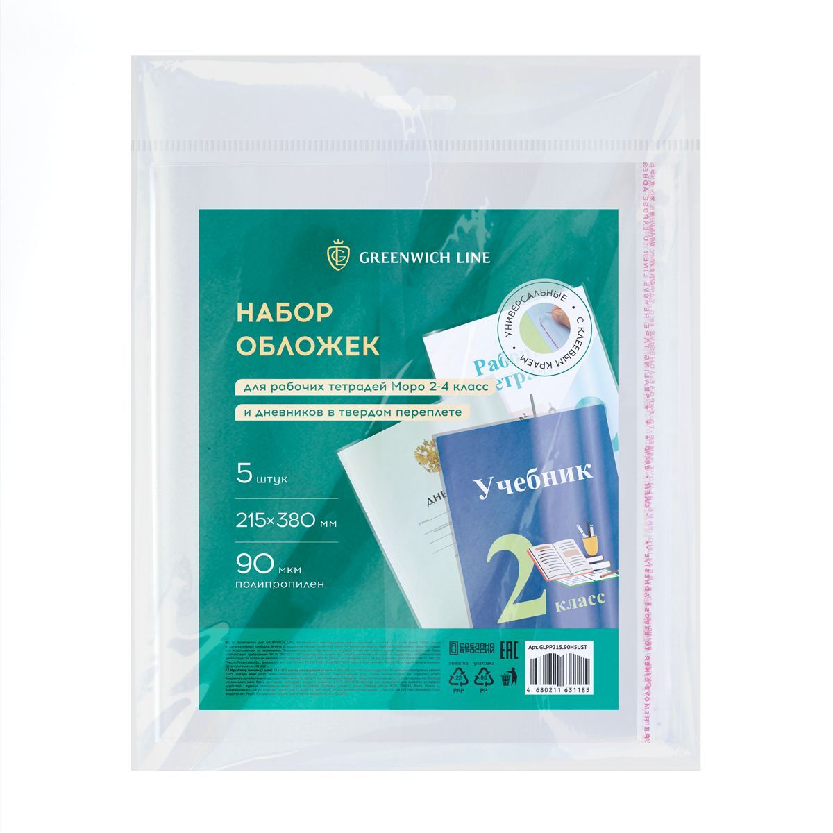 Набор обложек (5шт.) 215*380 для рабочих тетрадей Моро 2-4 класс, и дневников в твердом переплете, ПП 90мкм, универс. с клеевым краем, Greenwich Line