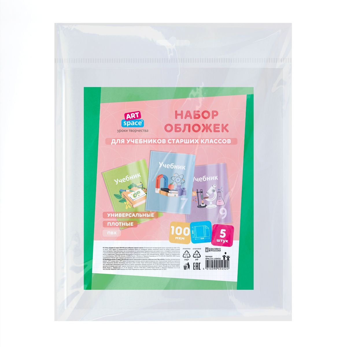 Набор обложек (5шт.) 230*450 для учебников старших классов, ПВХ 100мкм, универсальные, ArtSpace