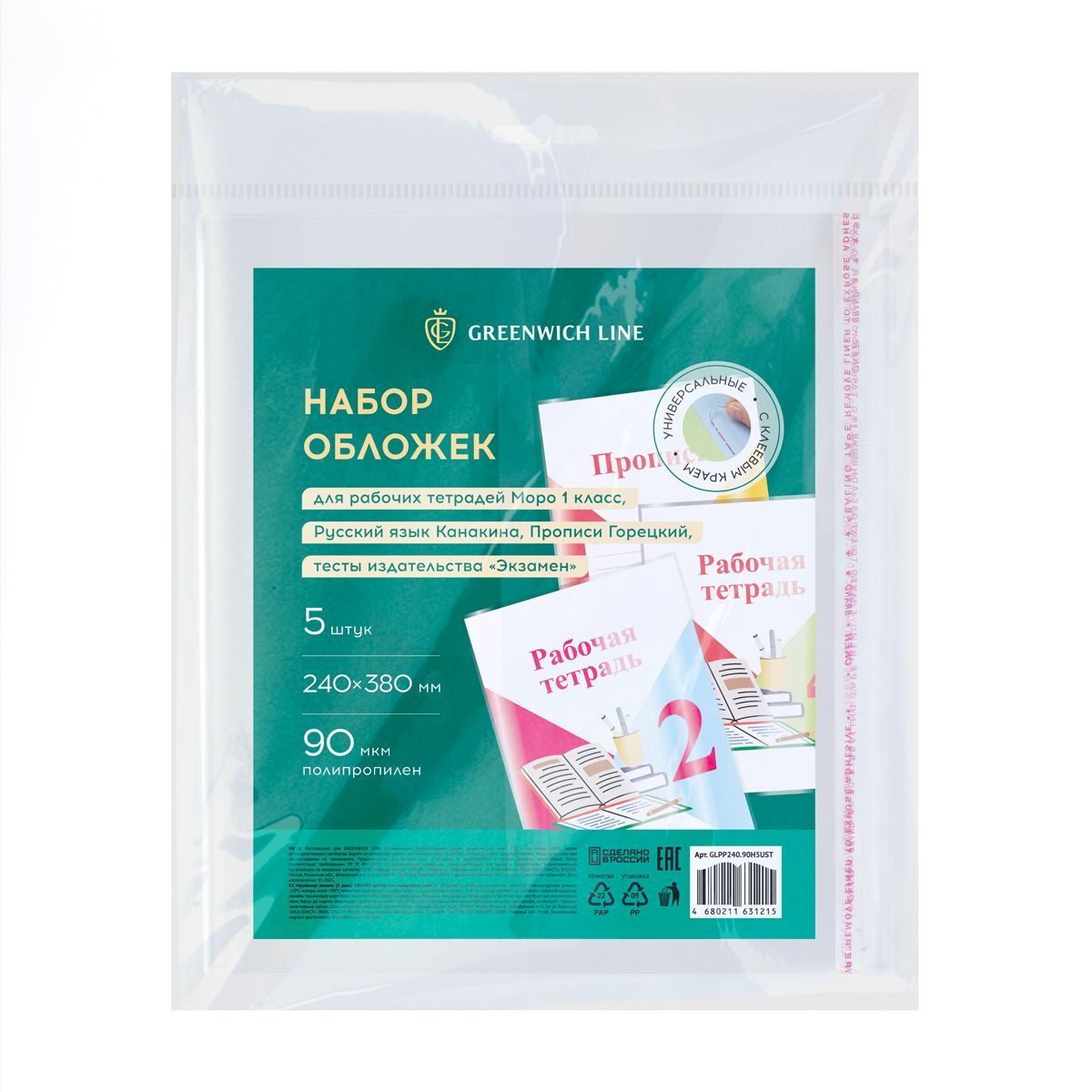 Набор обложек (5шт.) 240*380 для раб.тетр. Моро 1кл.,Рус.яз.Канакина,Прописи Горецкий,тесты изд.."Экзамен", ПП 90мкм, унив. с кл. краем,Greenwich Line