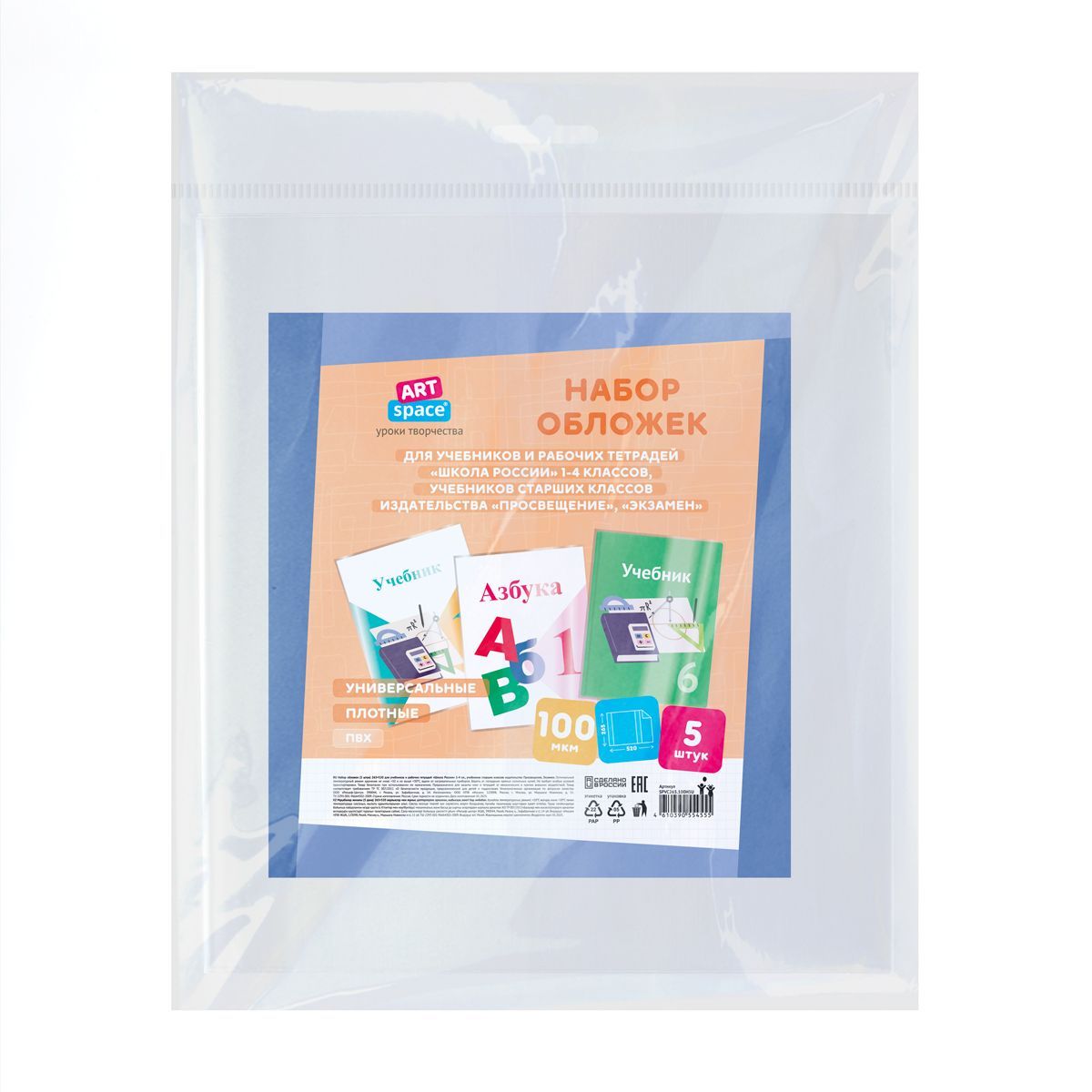 Набор обложек (5шт.) 265*520 для учеб. и раб.тетр "Школа России"1-4кл, учебн.стар. кл. издат.Просвещение,Экзамен,ПВХ 100мкм, универсальные,ArtSpace