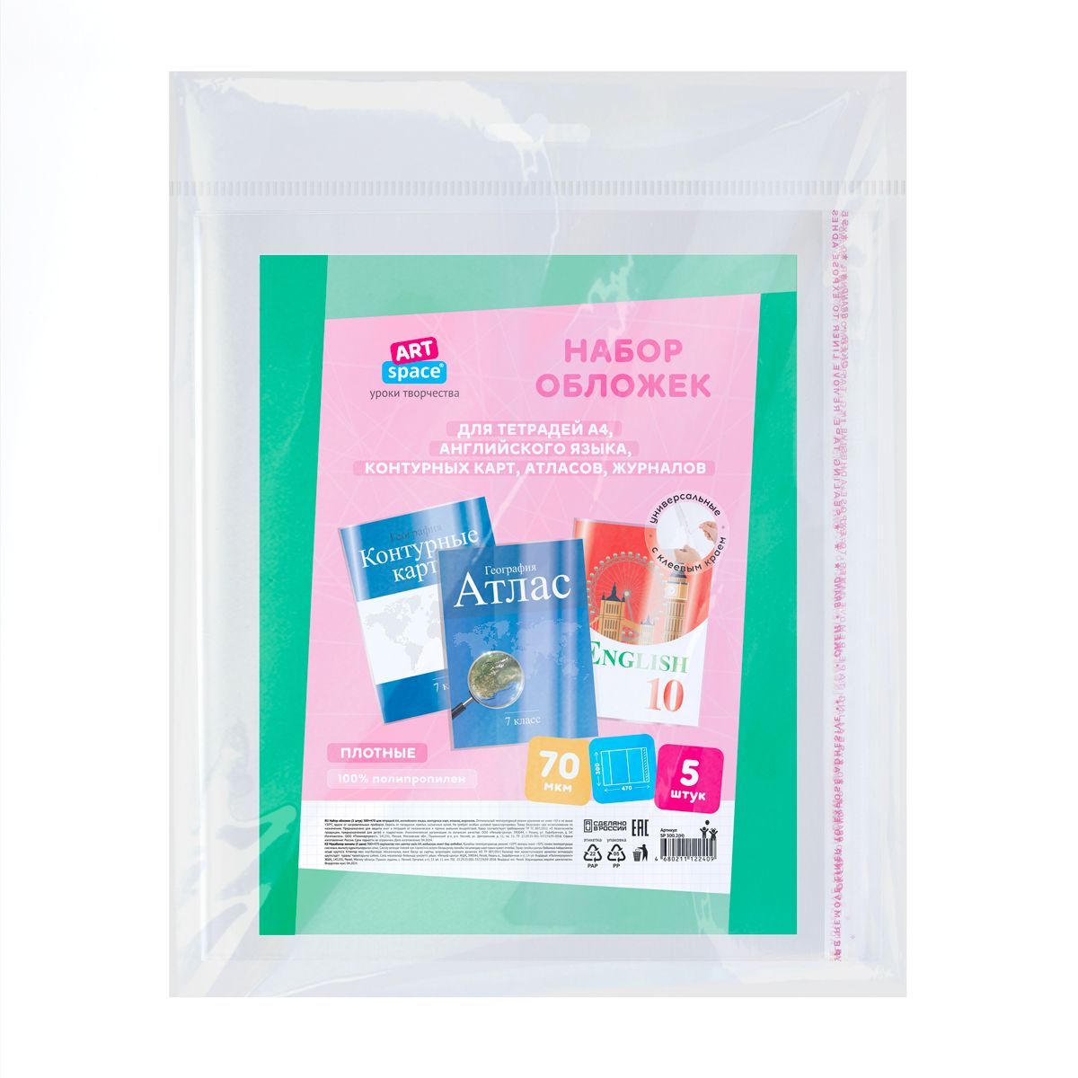 Набор обложек (5шт.) 300*470 для учебников и тетрадей А4/контурных карт и атласов, универсальная липким слоем, ArtSpace, ПП 70мкм