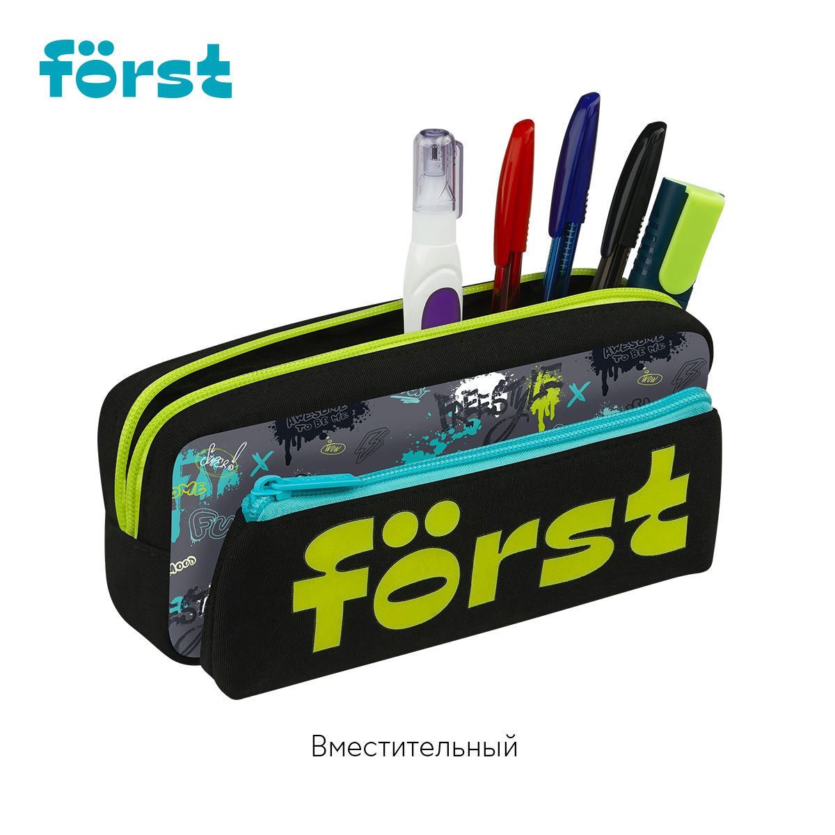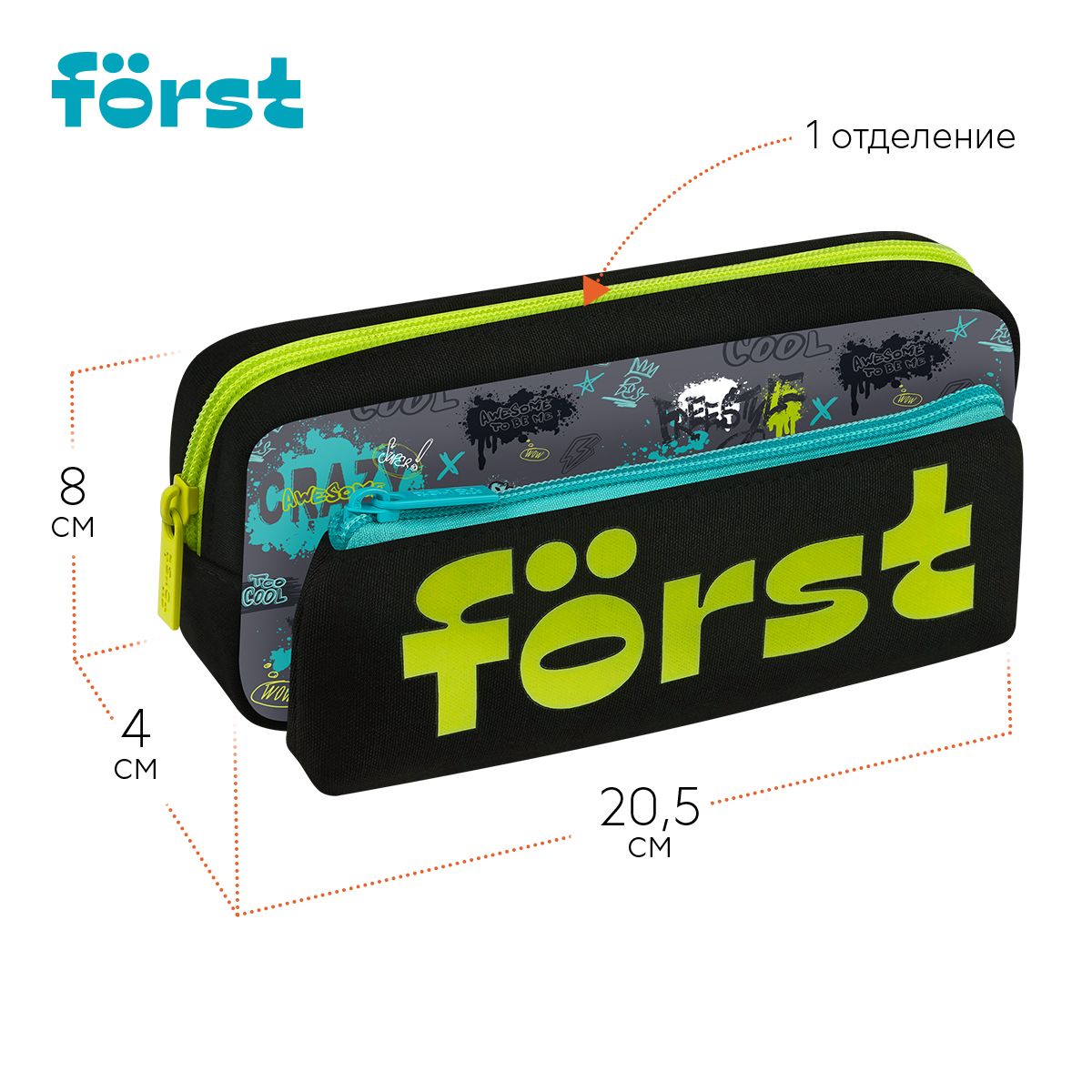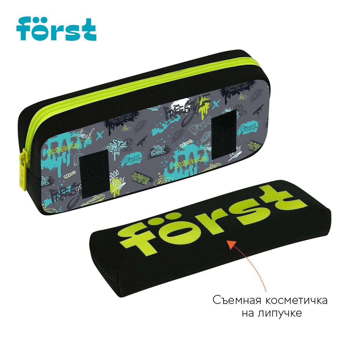 Пенал мягкий 2 в 1, 1 отделение, 205*80*40 Först "Freestyle", съемная косметичка на липучке