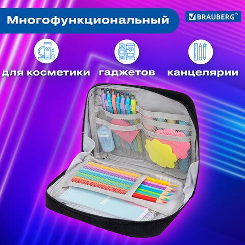 Пенал-органайзер BRAUBERG, 1 отделение, наклейки, молния вокруг, канвас, 22x15х4см, фиолетовый, 273596