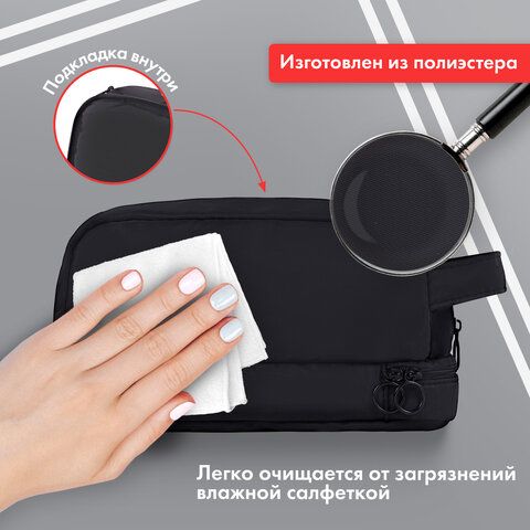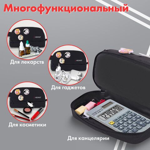 Пенал-органайзер HEIKKI (ХЕЙКИ) с ручкой, значки, 2 отделения, откидная планка, 22x13х10 см, черный, 273599