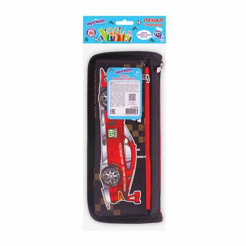 Пенал ЮНЛАНДИЯ для мальчиков, 2 отделения, мягкий, "Машина", черный, 21х6х9 см, 228982