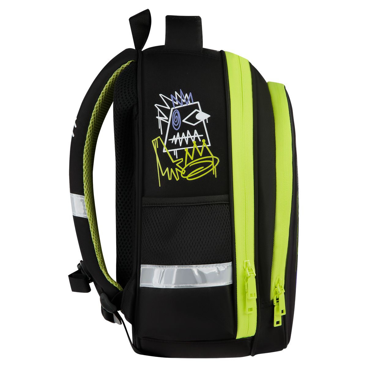 Непромокаемое дно дополнено ножками. Светоотражающие элементы на передней и боковых частях, а также на лямках помогут обезопасить ребёнка на дороге в условиях плохой видимости. Ранец оснащён плотной ручкой и петлёй для подвешивания на крючок.