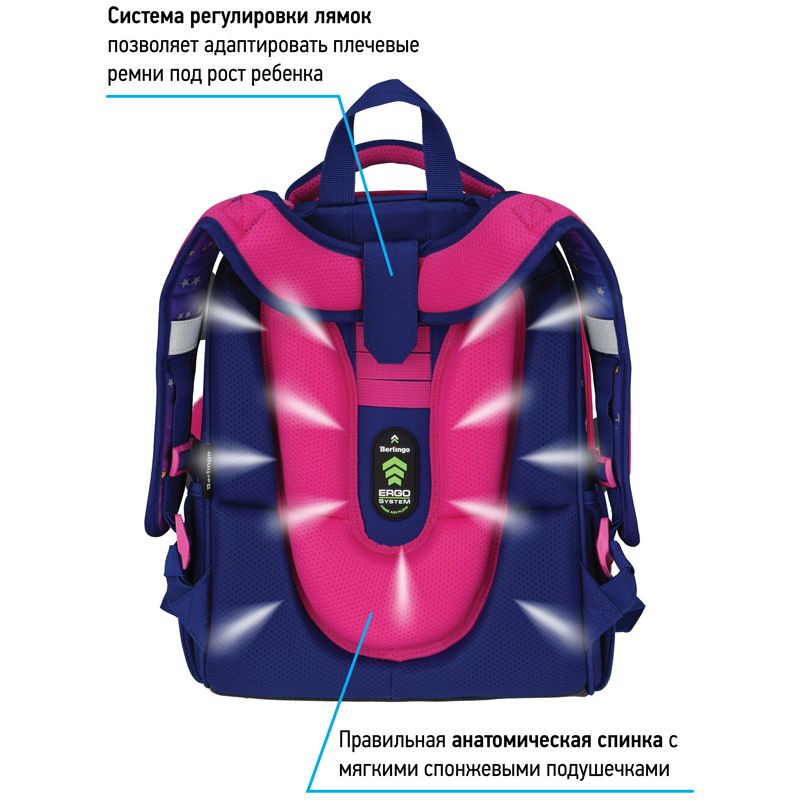 Школьный ранец имеет 2 отделения, 2 боковых кармана на резинке, съемный кошелек на лямке для быстрого доступа к необходимым вещам. Внутри предусмотрены разделители для учебных пособий, органайзер для письменных принадлежностей, карман для мобильного телефона, карабин для ключей и именная карточка для подписи. Уплотненная мягкая ручка и петля для подвешивания к парте делают ранец очень удобным. Дно выполнено из водонепроницаемого материала с пластиковыми ножками для защиты от влаги. Световозвращающие элементы на лямках, передней и боковых частях ранца обеспечивают безопасность ребенка в темное время суток. Подвеска в подарок.