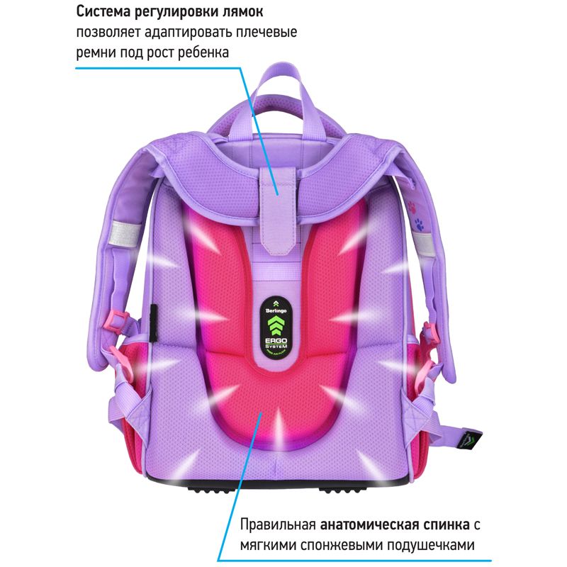 Благодаря анатомической вентилируемой спинке, регулируемым по длине и высоте лямкам, а также нагрудному креплению ранец плотно фиксируется на спине ребенка, что помогает равномерно распределить нагрузку и сохранить правильную осанку. Уплотненная мягкая ручка и петля для подвешивания к парте делают ранец очень удобным. Дно выполнено из водонепроницаемого материала с пластиковыми ножками для защиты от влаги. Световозвращающие элементы на лямках, передней и боковых частях ранца обеспечивают безопасность ребенка в темное время суток. Подвеска в подарок. Вес ранца менее 1 кг.