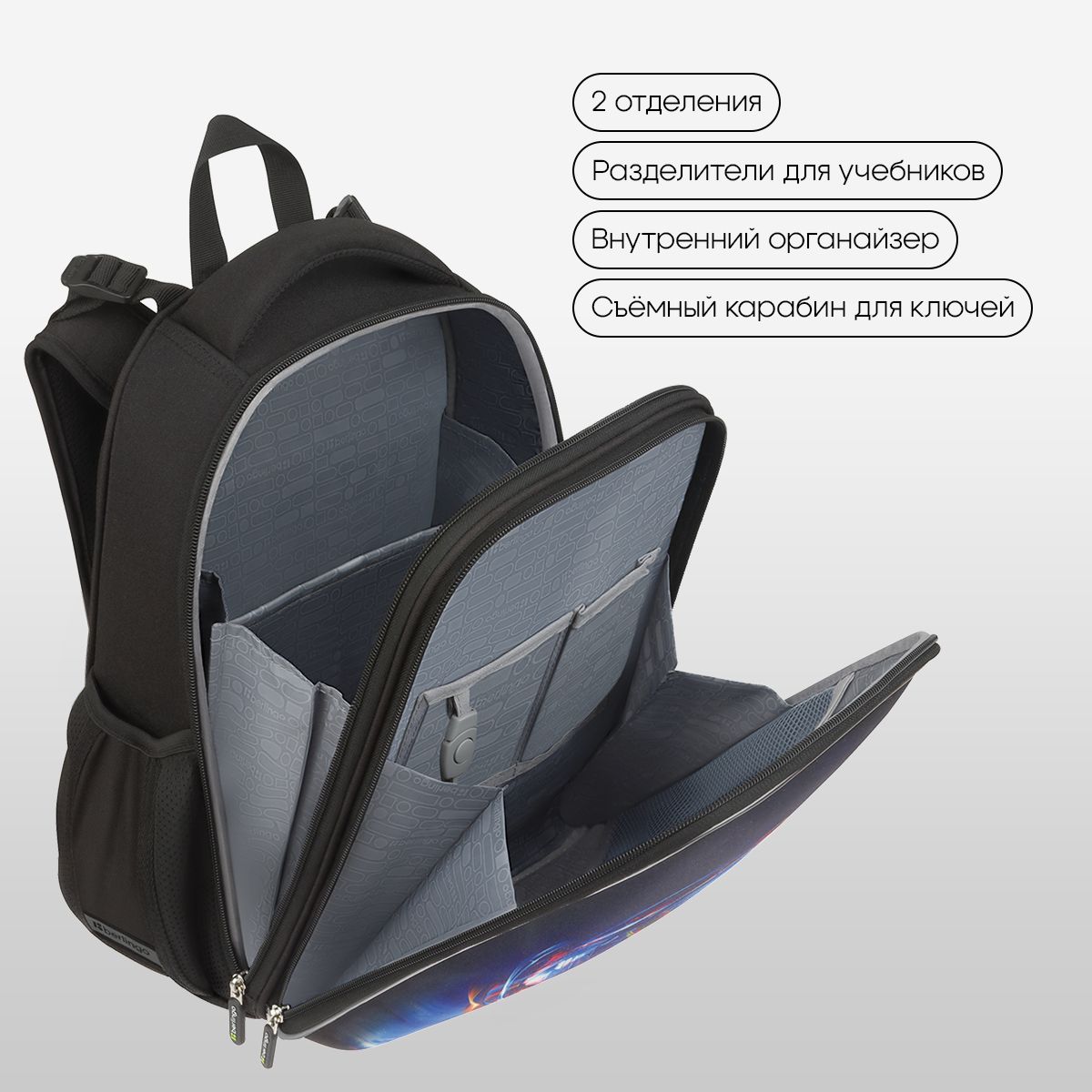 Ранец имеет 2 отделения, 2 боковых кармана на резинке, съемный кошелек на лямке для быстрого доступа к необходимым вещам. Внутри предусмотрены разделители для учебных пособий, органайзер для письменных принадлежностей, карман для мобильного телефона, съемный карабин для ключей и именная карточка для подписи.