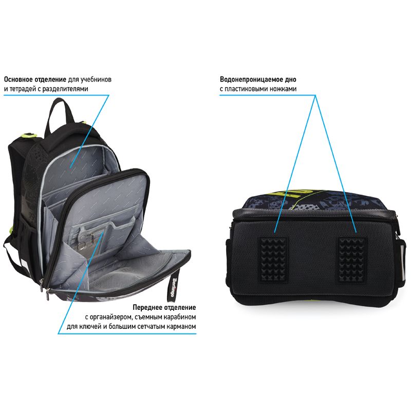 Ранец объёмом 16,5 литров имеет 2 отделения, 2 боковых кармана на резинке, съемный кошелек на лямке для быстрого доступа к необходимым вещам. Внутри предусмотрены разделители для учебных пособий, органайзер для письменных принадлежностей, карман для мобильного телефона, карабин для ключей и именная карточка для подписи.