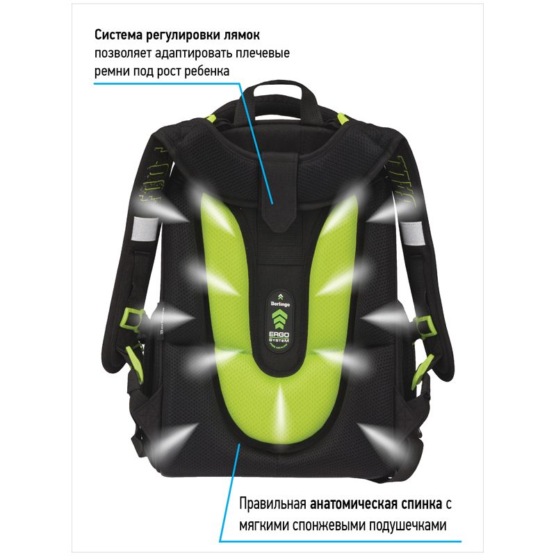 Благодаря анатомической вентилируемой спинке, регулируемым по длине и высоте лямкам, а также нагрудному креплению ранец плотно фиксируется на спине ребенка, что помогает равномерно распределить нагрузку и сохранить правильную осанку. Уплотненная мягкая ручка и петля для подвешивания к парте делают ранец очень удобным. Дно выполнено из водонепроницаемого материала с пластиковыми ножками для защиты от влаги. Световозвращающие элементы на лямках, передней и боковых частях ранца обеспечивают безопасность ребенка в темное время суток. Подвеска в подарок. Вес ранца менее 1 кг.