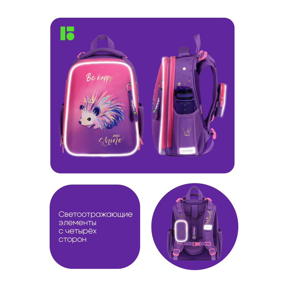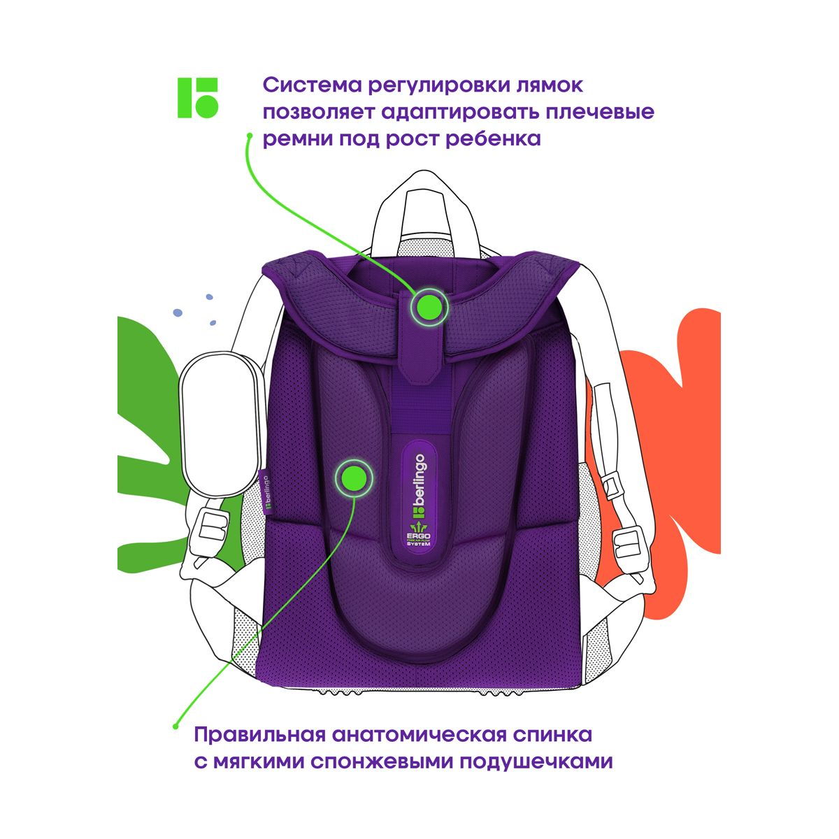 Благодаря анатомической вентилируемой спинке, регулируемым по длине и высоте лямкам, а также нагрудному креплению ранец плотно фиксируется на спине ребенка, что помогает равномерно распределить нагрузку и сохранить правильную осанку. Уплотненная мягкая ручка и петля для подвешивания к парте делают ранец очень удобным. Дно выполнено из водонепроницаемого материала с пластиковыми ножками для защиты от влаги. Световозвращающие элементы на лямках, передней и боковых частях ранца обеспечивают безопасность ребенка в темное время суток. Фирменный брелок в подарок. Вес ранца менее 1 кг.