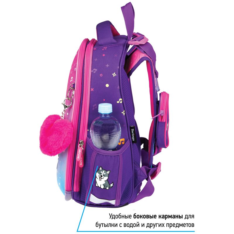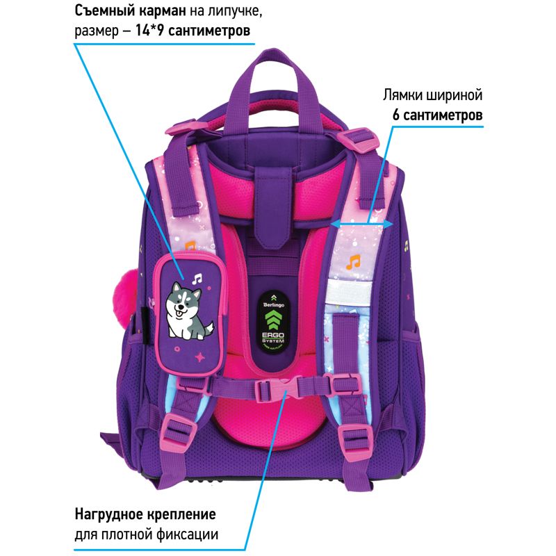 Ранец для школы имеет 2 отделения, 2 боковых кармана на резинке, съемный кошелек на лямке для быстрого доступа к необходимым вещам. Внутри предусмотрены разделители для учебных пособий, органайзер для письменных принадлежностей, карман для мобильного телефона, карабин для ключей и именная карточка для подписи. Уплотненная мягкая ручка и петля для подвешивания к парте делают ранец очень удобным. Дно выполнено из водонепроницаемого материала с пластиковыми ножками для защиты от влаги. Световозвращающие элементы на лямках, передней и боковых частях ранца обеспечивают безопасность ребенка в темное время суток. Подвеска в подарок.