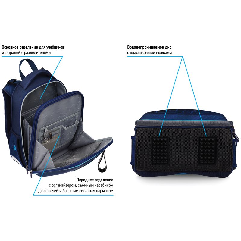 Ранец объёмом 16,5 литров имеет 2 отделения, 2 боковых кармана на резинке, съемный кошелек на лямке для быстрого доступа к необходимым вещам. Внутри предусмотрены разделители для учебных пособий, органайзер для письменных принадлежностей, карман для мобильного телефона, карабин для ключей и именная карточка для подписи.