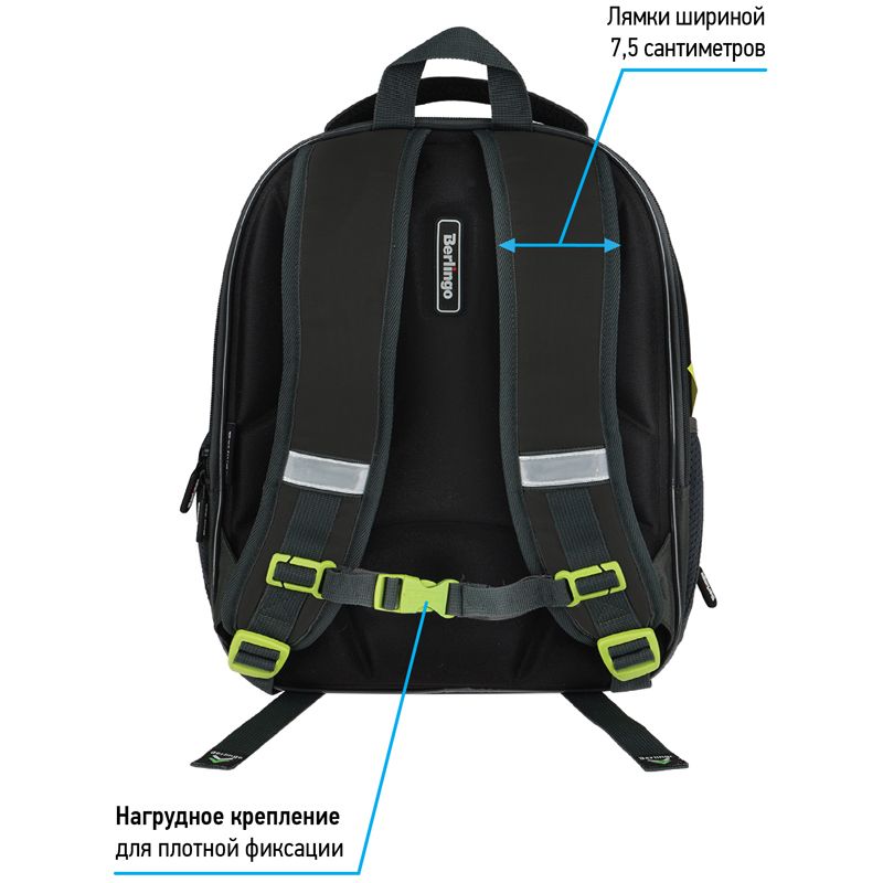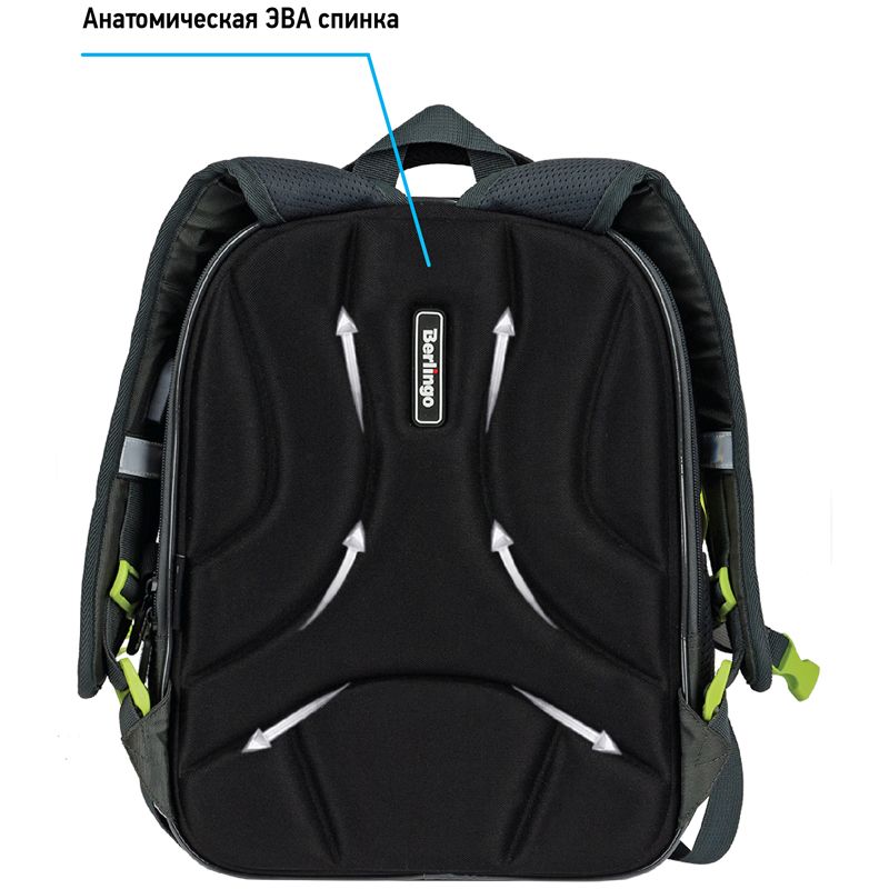 Передняя часть и спинка ранца жесткие, а боковые панели уплотнены слоем спонжа. Благодаря анатомической формованной спинке из ЭВА, а также регулируемым по длине лямкам и нагрудному креплению он плотно фиксируется на спине ребенка.