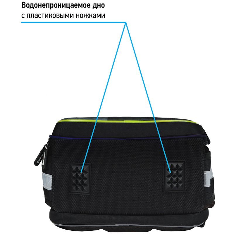 Дно выполнено из водонепроницаемого материала с пластиковыми ножками для защиты от влаги. Ранец оснащен плотной ручкой и петлей для подвешивания. Световозвращающие элементы на передней части, сбоку и на лямках обеспечивают безопасность в темное время суток. Вес менее 800 грамм.