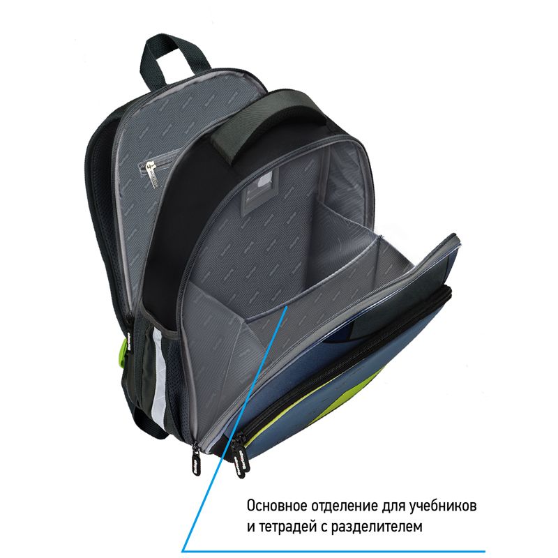 В модели объёмом 16 литров предусмотрены 3 отделения, 2 боковых кармана. Внутри имеются разделители для учебных пособий, карман на молнии, карабин для ключей, именная карточка.
