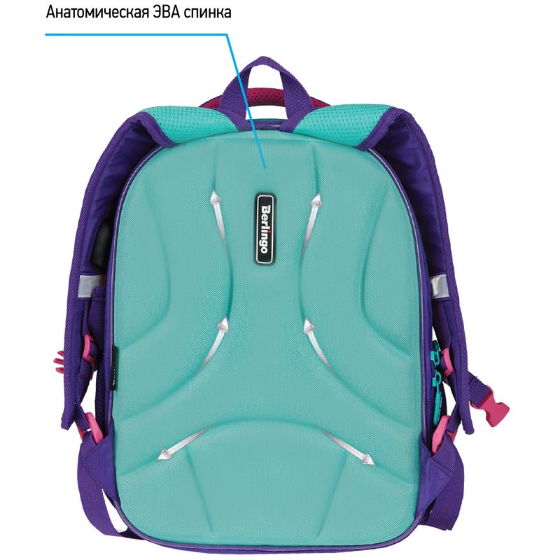 Передняя часть и спинка ранца жесткие, а боковые панели уплотнены слоем спонжа. Благодаря анатомической формованной спинке из ЭВА, а также регулируемым по длине лямкам и нагрудному креплению он плотно фиксируется на спине ребенка.