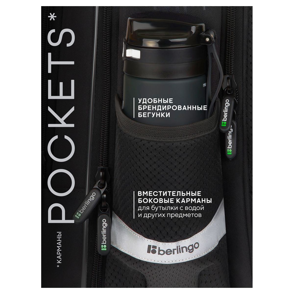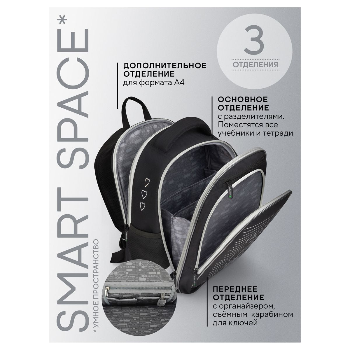 В ранце предусмотрены 3 отделения, 2 боковых кармана, карман для быстрого доступа, разделители для учебных пособий, а также удобный внутренний органайзер с карабином для ключей.