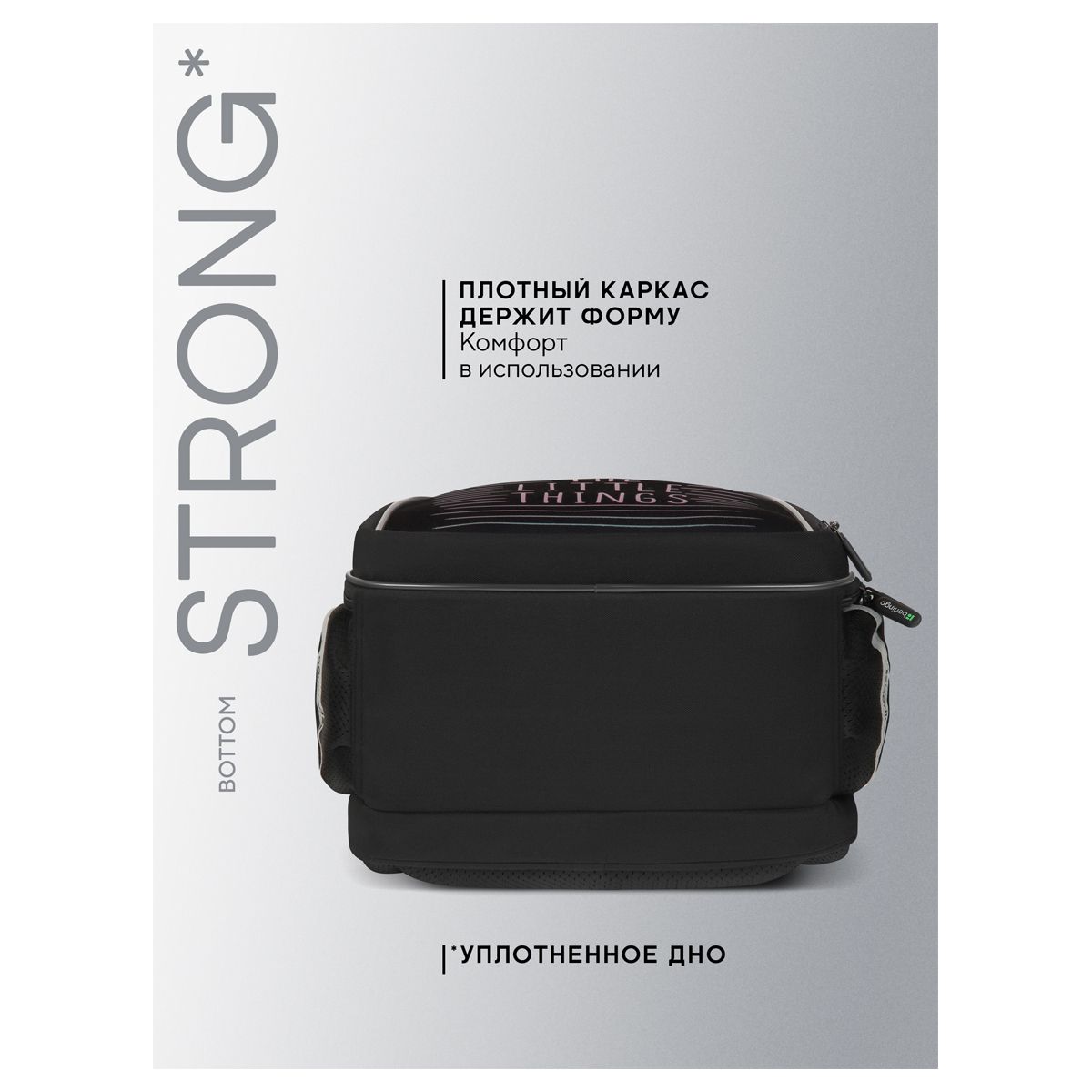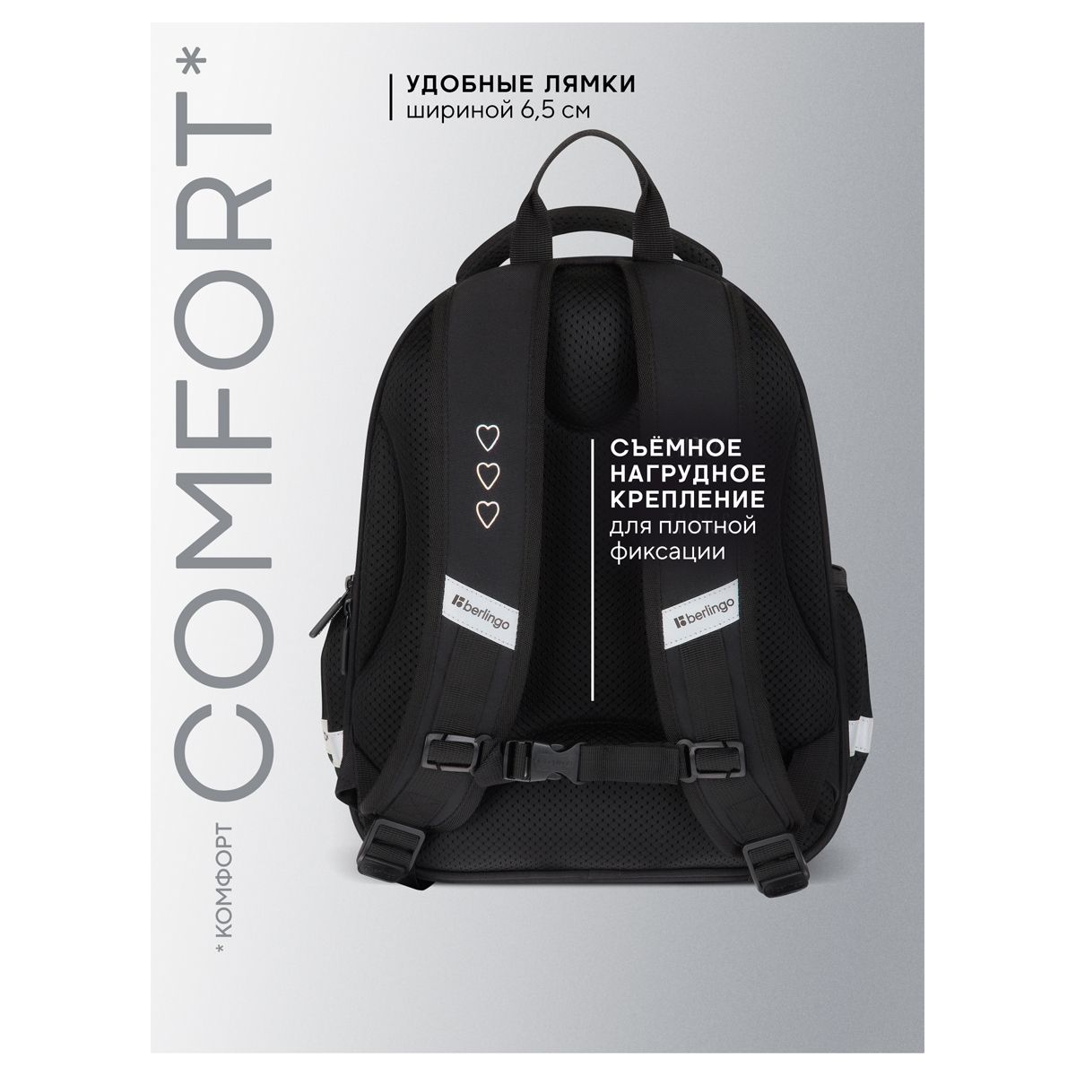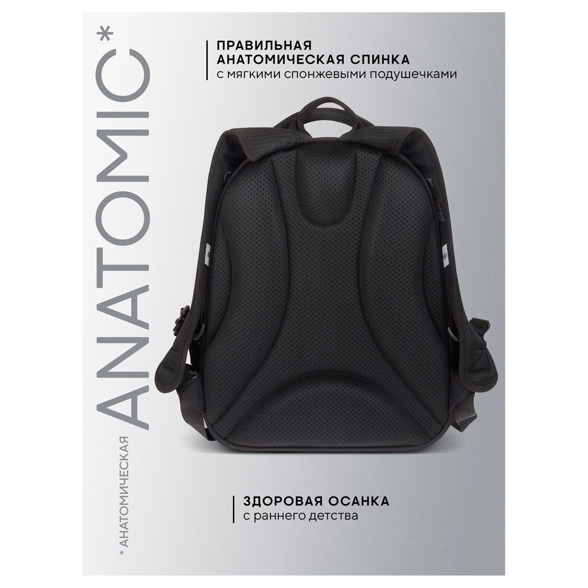 Благодаря анатомической вентилируемой спинке, а также регулируемым по длине лямкам и нагрудному креплению ранец плотно фиксируется на спине ребенка, равномерно распределяется нагрузка и сохраняется правильная осанка. Ранец оснащен плотной ручкой и петлей для подвешивания. Светооотражающие элементы на лямках, передней и боковой частях ранца обеспечивают безопасность в темное время суток.