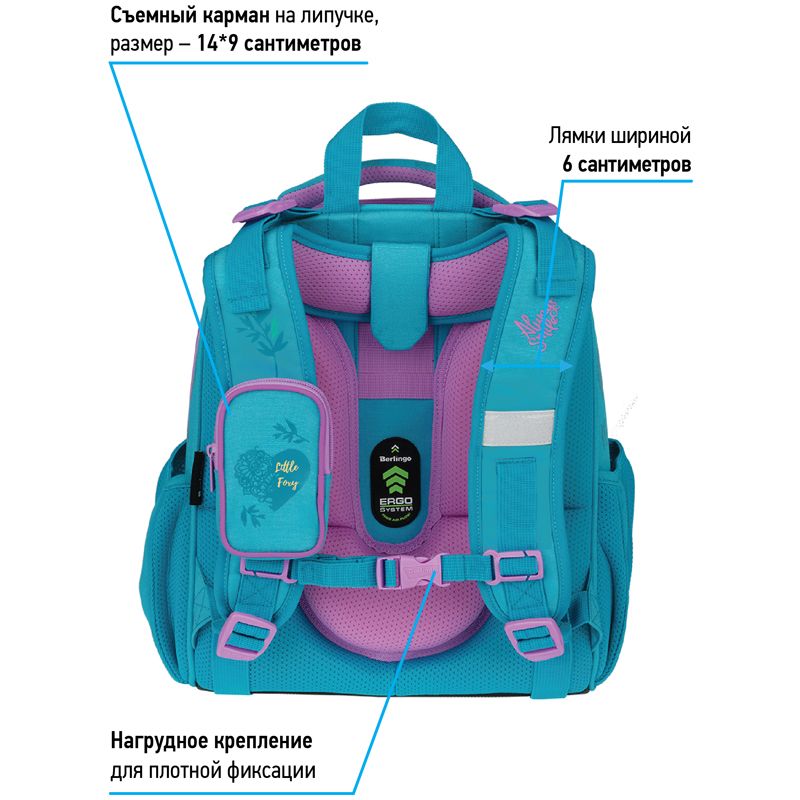 Благодаря анатомической вентилируемой спинке, регулируемым по длине и высоте лямкам, а также нагрудному креплению ранец плотно фиксируется на спине ребенка, что помогает равномерно распределить нагрузку и сохранить правильную осанку. Уплотненная мягкая ручка и петля для подвешивания к парте делают ранец очень удобным. Дно выполнено из водонепроницаемого материала с пластиковыми ножками для защиты от влаги. Световозвращающие элементы на лямках, передней и боковых частях ранца обеспечивают безопасность ребенка в темное время суток. Подвеска в подарок. Вес ранца менее 1 кг.