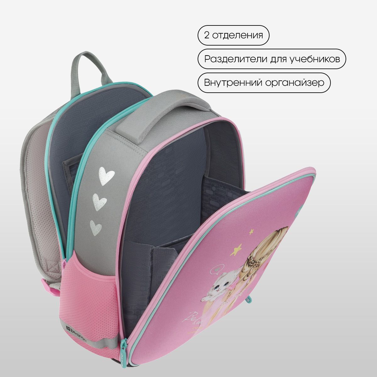 Ранец объёмом 13,5 литров имеет 2 отделения, одно из которых расположено у спинки и предназначено для учебных пособий формата А4+, 2 боковых кармана на резинке. Внутри предусмотрены разделители для учебных пособий и именная карточка для подписи.